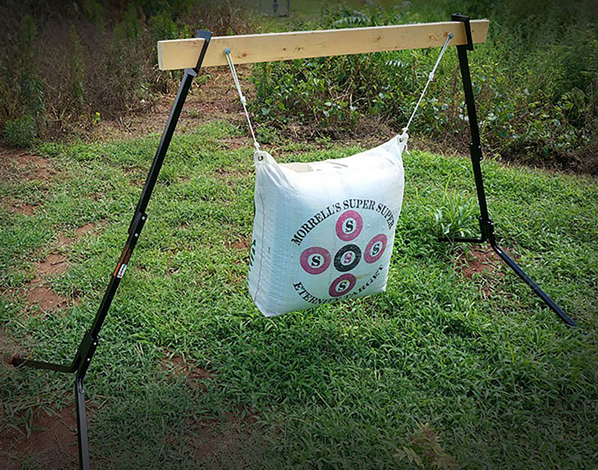 The viking adjustable target stand is a simple but effective leg stand set that allows you to set your targets at heights of 41" to 58" (exact heights will vary slightly due to terrain variations).This target stand setup lets you hang gongs, silhouette targets, archery bag targets or whatever your target preference happens to be.You can leave off the extension leg for lowest setting or install it if you like your targets higher.The user-supplied 2x4 lumber crossbar is locked-in with our welded capture system.Powder-coated frame pieces will last for years.