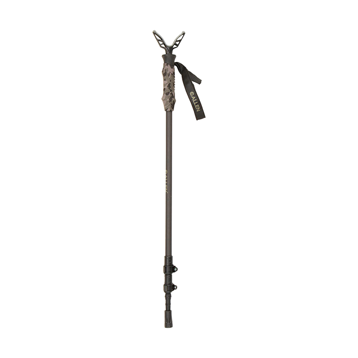 Allen's axial carbon atom shooting monopod stick is a lightweight carbon fiber stick.It is great for use in ground blinds as a shooting rest, camera base or with a spotting scope.The height adjust to 61".The removable cradle features a dura-grip rubber grip, aluminum locking cams, carbide tip, and rubber boot.