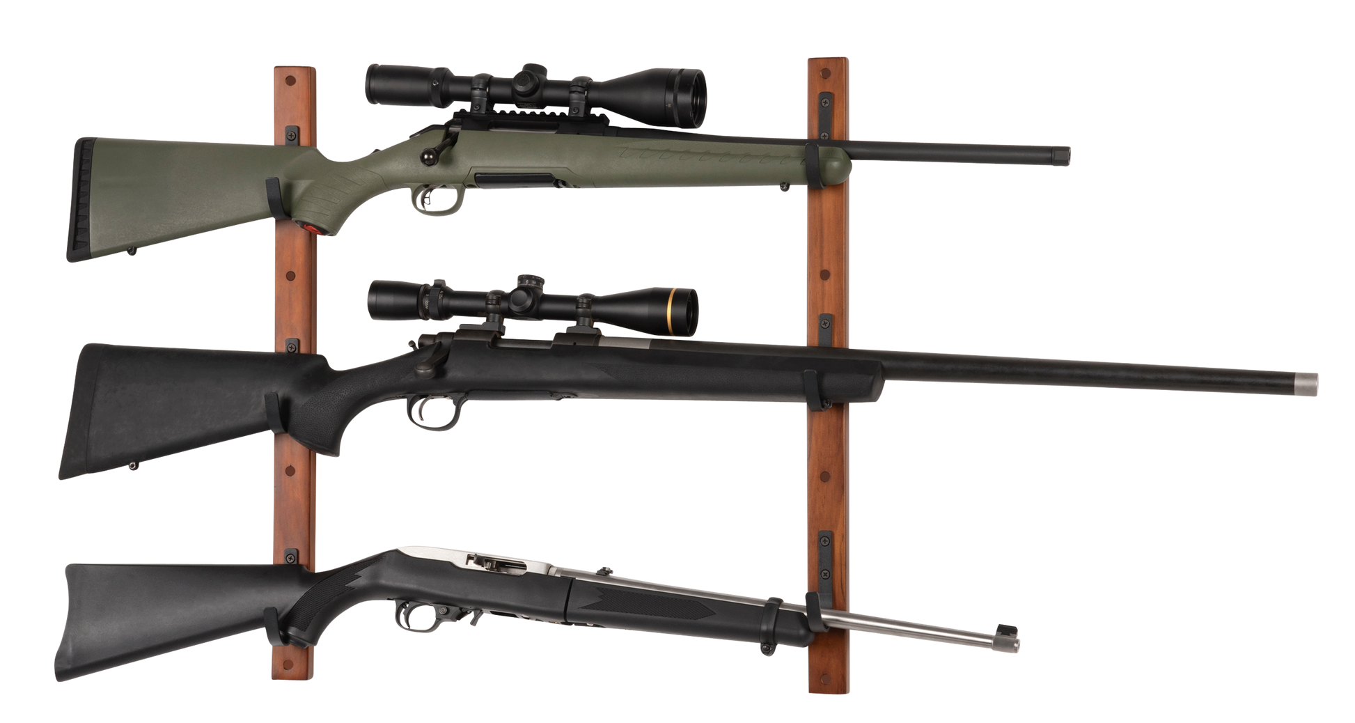 The gun collector gun rack is the must-have storage device.The durable long gun rack features extra gun space, sized to hold up to 3 firearms at a time.The hardwood base gives the rack a traditional rustic feel, made as a perfect display to add in your gun collection.The durable gun rack is constructed with two hardwood bases with padded steel hooks to cradle the guns without damaging the finish.Each frame contains 3 metal hooks, holding up to 45-pounds at a time.Complete assembly with the provided mounting screws and wall anchors.
