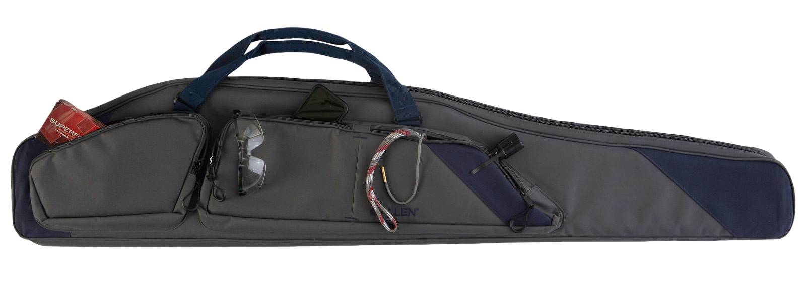 Allen's kenosha rifle case is constructed of rugged endura with dense foam padding, oversize/lockable zipper and three large gusseted accessory pockets.It has soft cotton handle with padding, hanging loop with d-ring and and adjustable sling.