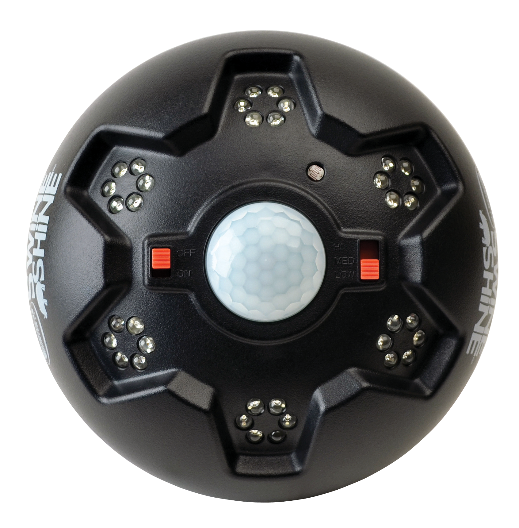 The swine shine hog light has a 360 degree pir motion sensor with fade on/off light activation.The cds light sensor has 36 green leds with 180 seconds of light per triggering.Degree's of light is high 100%, medium 60% and low 30% light power.Includes 4 mounting screws & nuts, universal mounting plate and 3m vhb all weather permanent mounting tape.Powered by 8 aa batteries (not included).