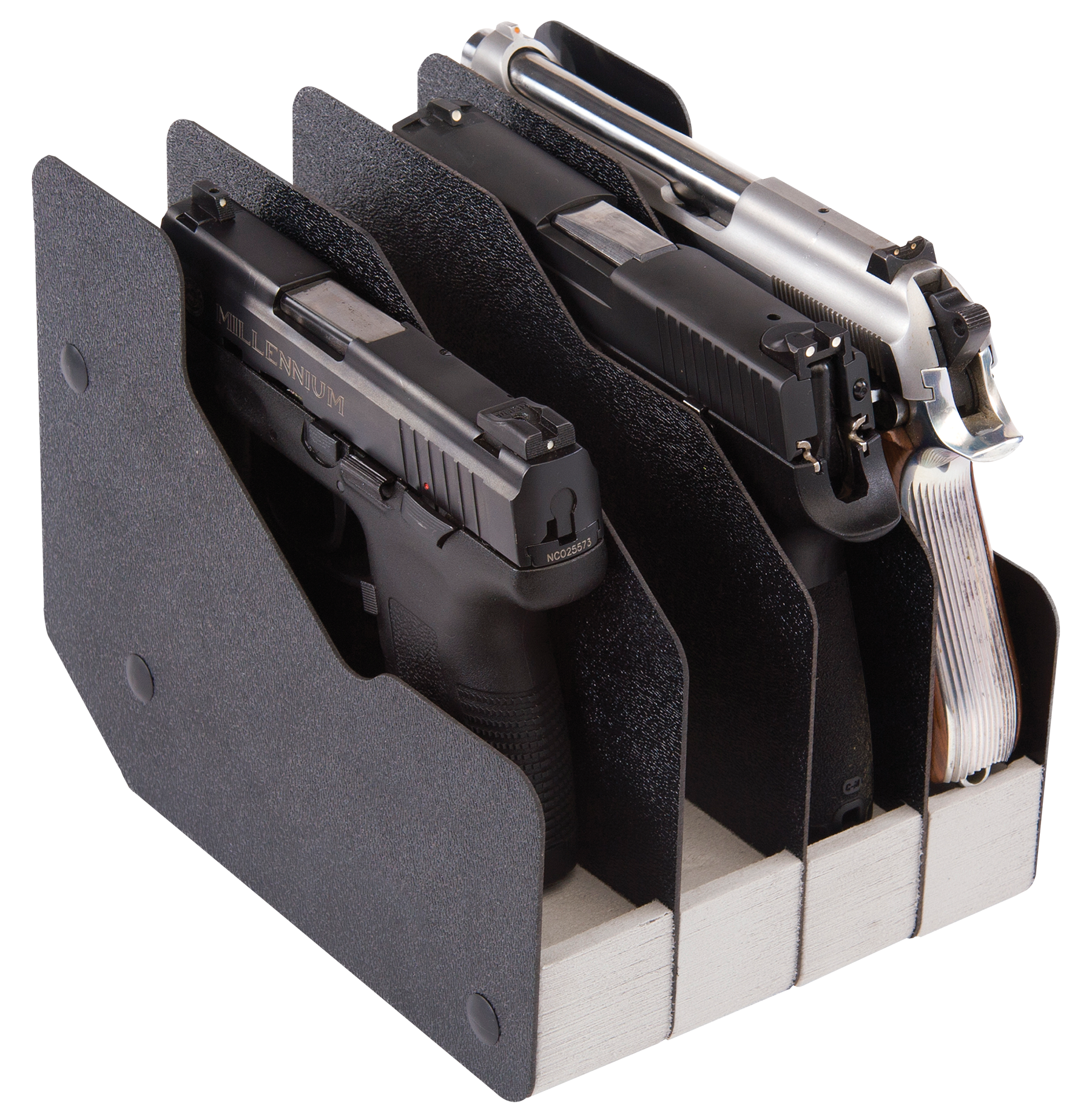 The weaponrac four pistol rac provides ready access containment for the storage of your pistols.It will hold up to four handguns and is lightweight with high resiliency and has great shock absorption.Contains no latex and is chemical resistant so you can store your well oiled weapons.Its offers extreme low water absorption, making it impervious to rot, mold and mildew.It is and made in the usa.