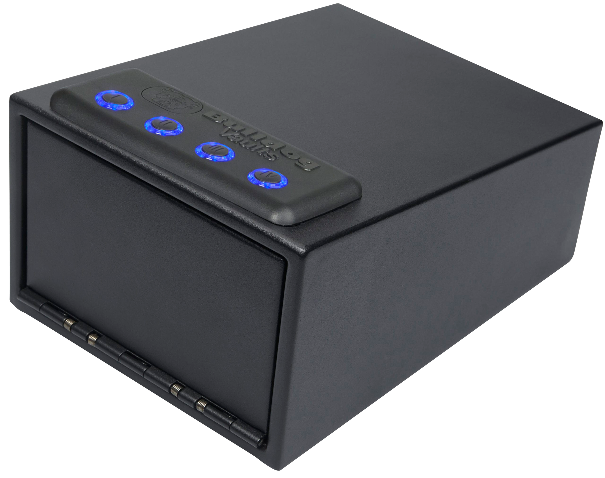 Bulldog's magnum led quick vault protects your firearms and valuables.Quick opening, tamper resistant spring loaded door with quiet, soft stop technology allows retrieval of your firearm without revealing your location.Features separate power button that ensures all four led access buttons are backlit for accurate code entry, interior light when door is opened, choice of audible or silent mode and low battery indicator.Includes one quick vault, one emergency key and operating instructions.Requires four aa alkaline batteries (not included).