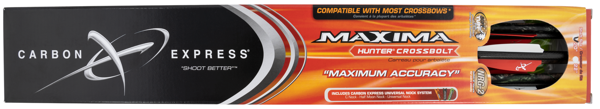 Maxima hunter crossbolt features dual spine weight forward two spines in 1 arrow.This patented fusion of two different carbon materials makes for better energy management and faster recovery.Bolts spin 20% sooner, retain more speed and deliver unparalleled accuracy.Bufftuff plus precision design with patented bufftuff plus carbon weave for superior strength and accuracy.Proven camo mossy oak treestand pattern helps make the maxima hunte the most proven camouflage bolt in the carbon express lineup.The 6 pack includes inserted moon nocks, 6 universal nocks and 6 c nocks.