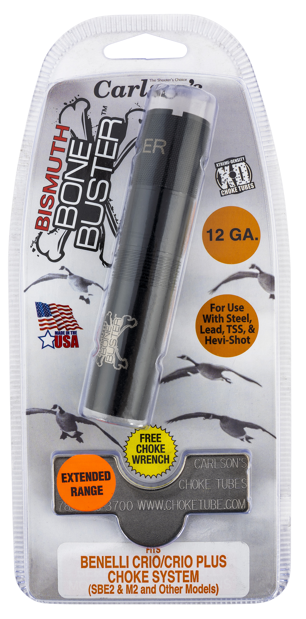 The bismuth bone buster choke tube is designed to produce excellent, dense patterns with all bismuth ammunition.It is cnc precision machining from 17-4 heat treated stainless steel featuring a longer parallel section (inside the choke) over conventional factory choke tubes.Combine this with extensive testing with various loads and you have the perfect choke to deliver devastating patterns with bismuth.The bismuth chokes can be used with all lead and hevi-shot loads.Experience the bone crushing dense patterns with the bismuth choke tubes.The extended range choke tube can be used with all steel shot not larger than #2.