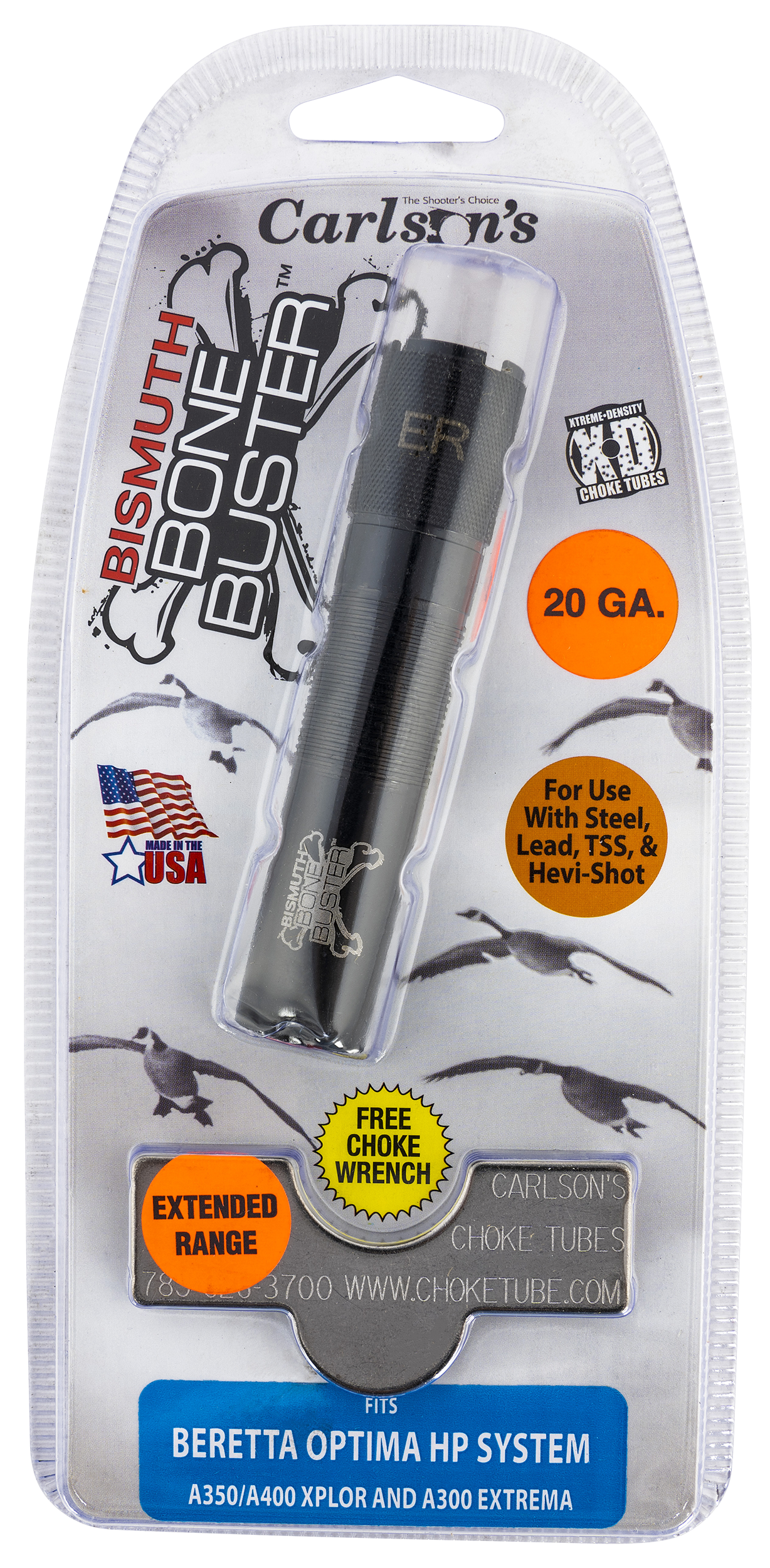 The bismuth bone buster choke tube is designed to produce excellent, dense patterns with all bismuth ammunition.It is cnc precision machining from 17-4 heat treated stainless steel featuring a longer parallel section (inside the choke) over conventional factory choke tubes.Combine this with extensive testing with various loads and you have the perfect choke to deliver devastating patterns with bismuth.The bismuth chokes can be used with all lead and hevi-shot loads.Experience the bone crushing dense patterns with the bismuth choke tubes.The extended range choke tube can be used with all steel shot not larger than #2.