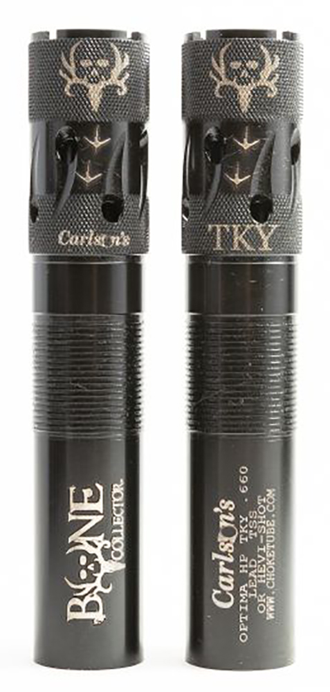 Carlsons ported bone collector turkey choke tubes feature a super tight, pattern tested constriction that throws extremely tight patterns with all shotshell ammunition loaded for turkey hunting including lead, nickel-plated, copperplated, bismuth, hevi-shot, tungsten, and tss.A longer taper section to the constriction (parallel section of choke tube) insure tight patterns with less flyers.More pellets on target every shot! the bone collector choke tubes are precision-machined from 17-4 heat treated stainless steel and feature a non-reflective matte black finish.Each choke tube constriction has been pattern tested and has thrown the best patterns with 4 through 10 shot.If you wish to use shot sizes larger than #4 shot, use a more open choke tube for optimum patterning.Remember to pattern your shotgun choke tube with the specific shot shell load you are going to be using.Different types and manufacturers of ammunition will throw different patterns from the same choke tube.