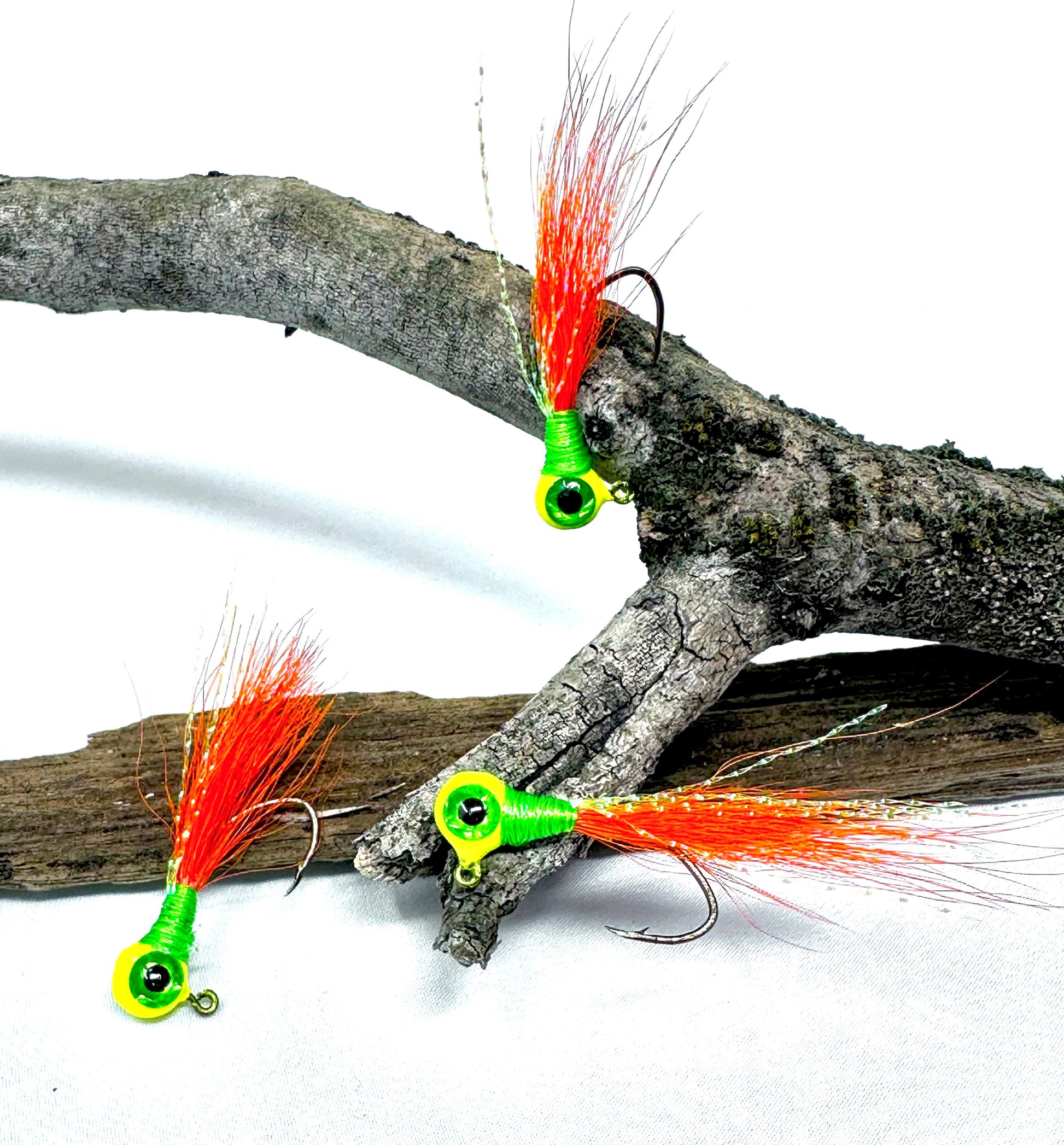 crappie hand tied jigs -popeye Lemon Orange, 3 pack custom hand tied crappie jigs by Sid Louis Jr