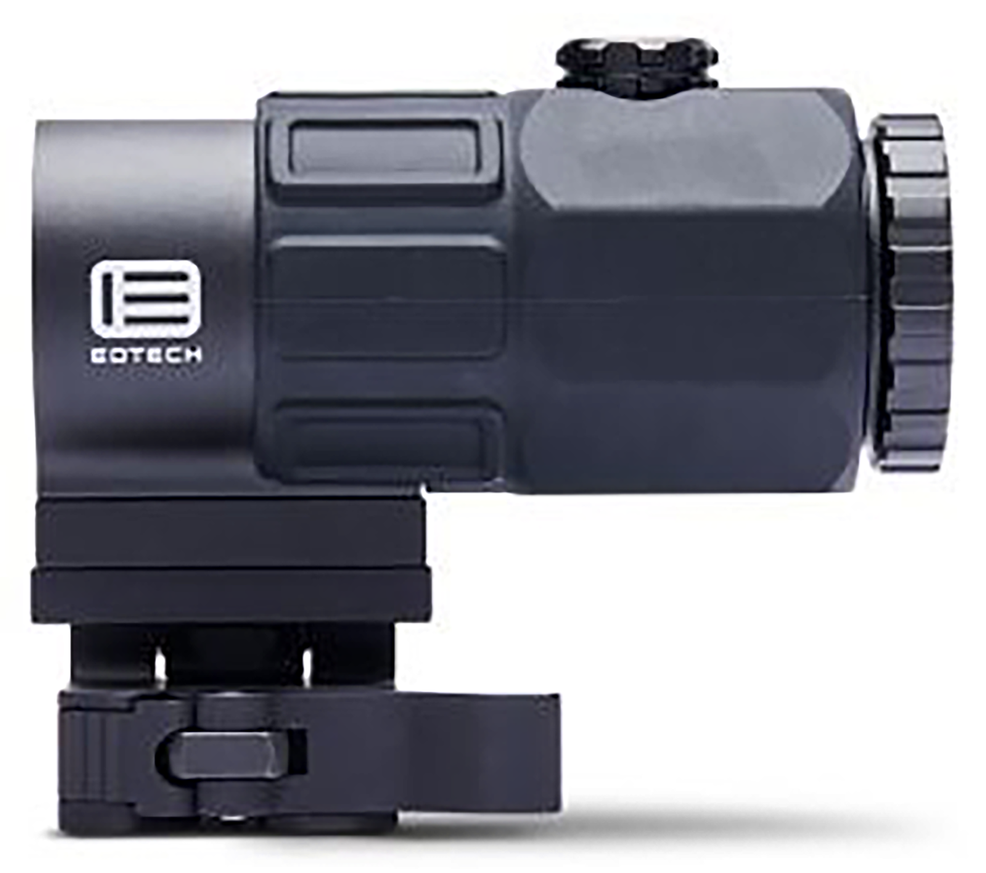 The g45.Sts 5x magnifier has the similar weight and dimensional properties as the existing g33 magnifier, but with an additional 2x magnification for precision aiming at greater distances.The mount provides fast transitioning from 5x to 1x and the optic offers tool-free vertical and horizontal adjustments with a large field-of-view.The g45 works with all eotech hws models.Includes manual, switch-to-side mounting system and case.