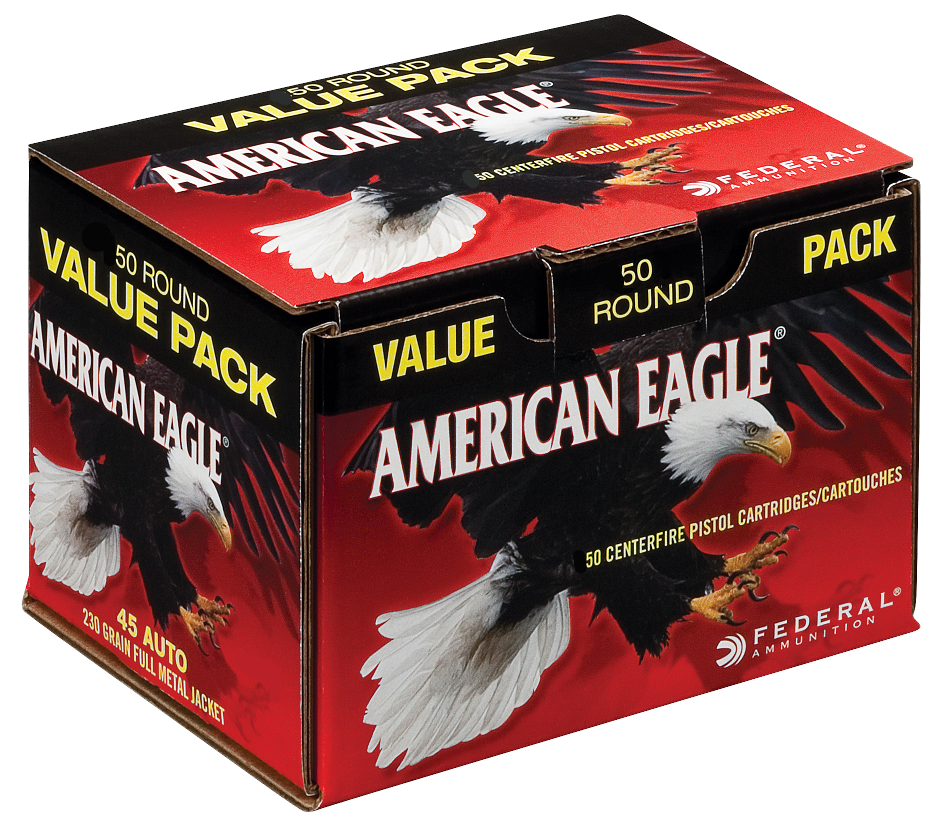 Federal's american eagle 45 acp cartridges feature a 230-grain full metal jacket projectile cased in brass.With a muzzle velocity of 890 fps and 404 ft lbs of power, these come packaged as 50 rounds per box, 10 boxes per case.
