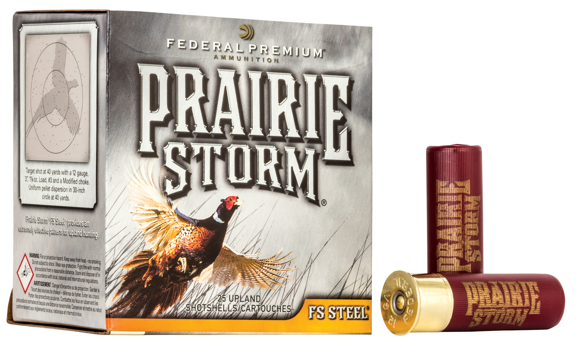 Pheasants are fast, tough birds.That's why federal has combined the flitecontrol wad and flitestopper pellet technologies to create prairie storm fs steel.It puts more than 75 percent of its pellets in a 30-inch circle at 40 yards, with energy similar to the most popular lead loads.