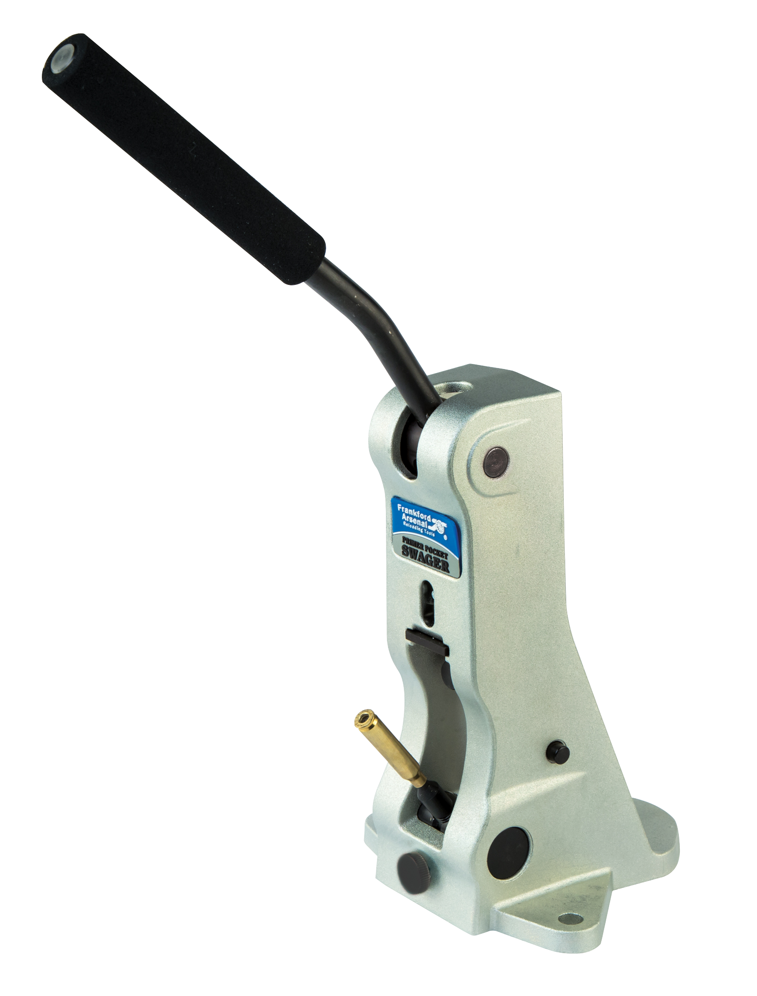 The frankford arsenal primer pocket swager easily removes military crimp with this ergonomic upright designed swager that can be c-clamped or permanently mounted to any workbench.You no longer have to fiddle with aligning the primer pocket perfectly, simply utilize the included large and small case holders and the easy-to-use swing out access to quickly insert, swage and remove brass.Its features a die-cast aluminum construction with a benchtop mounting feature, quick-change swage pin for large or small primer pocket use, adjustable brass positioning to ensure a centered swaging pin and an auto-eject case pin holder for easy loading and unloading.Includes a large case holder and a small case holder.
