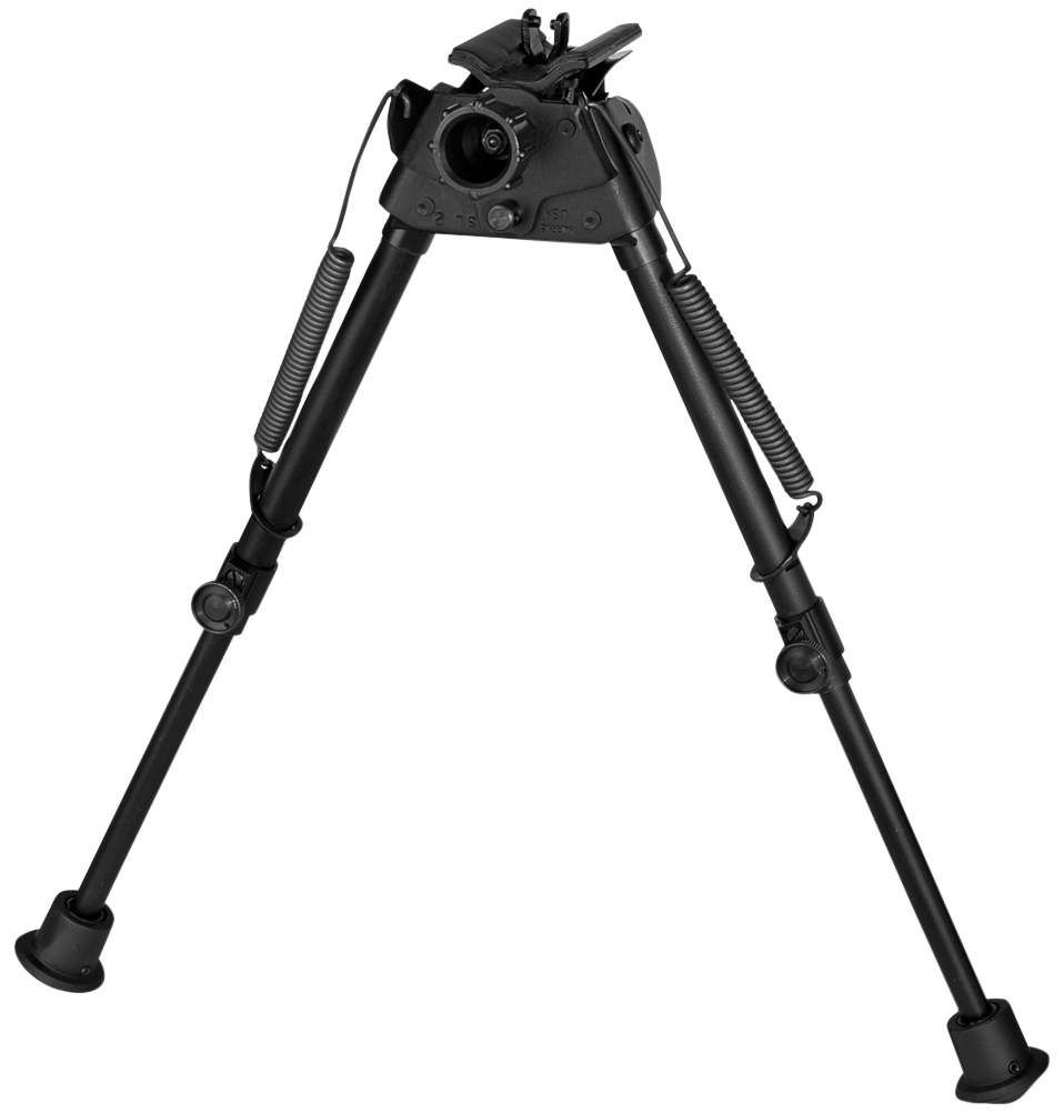 Harris bipods clamp to most sling swivel stud equipped bolt action rifles, and have a sling attachment provision.Spring loaded self-leveling folding legs are quickly adjustable for height.Manufactured with heat treated steel and hard alloys, bipods have a black anodized finish.