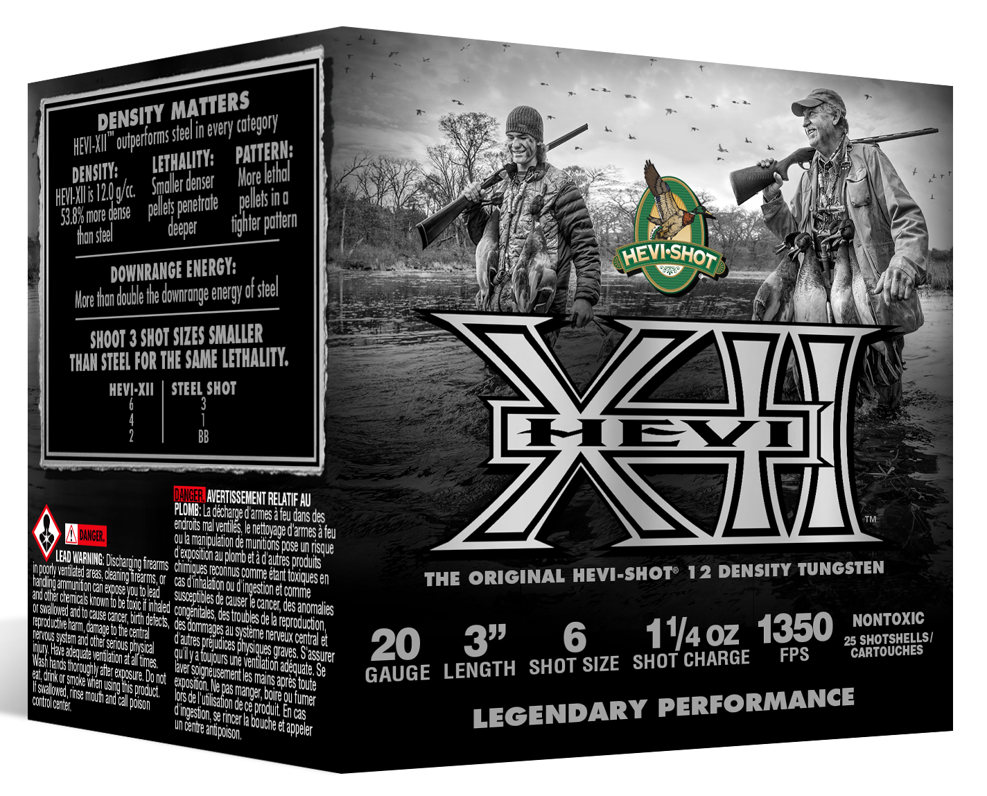 The original hevi-shot, now in a 25-round box.Introducing hevi-xii.Shoot three shot sizes smaller than steel for the same lethality with 28% more tungsten pellets on target.The end result? more kills, fewer cripples, better stories.Pack hevi-xii in and walk out carrying extra weight.