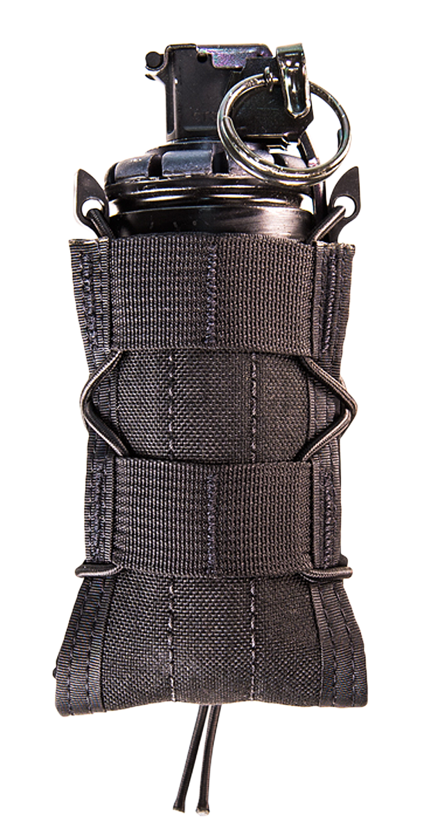 This pouch uses injection molded polymer sides, cordura front and back and shock cord lacing to lock just about any rifle magazine into place.Usgi, hk, pmag, arc, fal, ak 30//40, lr20 and m14 magazines are all held securely and deployed easily and silently on demand.The taco even works for certain radios, flash bangs and smoke grenades and provides this versatility while taking up only 3" horizontal inches on your platform.The taco maintains a positive, adjustable grip on its contents without additional securing systems.However, if additional retention is desired webbing tabs are sewn in on the top for use of "over the top" bungee retainers and loop velcro is sewn on the interior if the users wishes to use adhesive hook on the magazine.