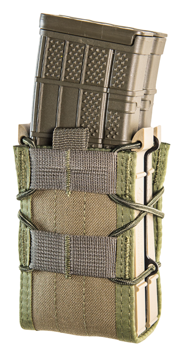 This line of polymer tacos function much the same as their nylon counterparts.The body and brackets are made with a durable and flexible, proprietary polymer and are laced together with a bungee cord.As with the originals, these pouches grip and retain a wide variety of magazine styles and calibers.It mounts to both molle and belts up to 2" with high speed gear's universal hsgi clips, has a pop lock configuration that orients excess bungee down and out of the way, and features grommets for drainage.