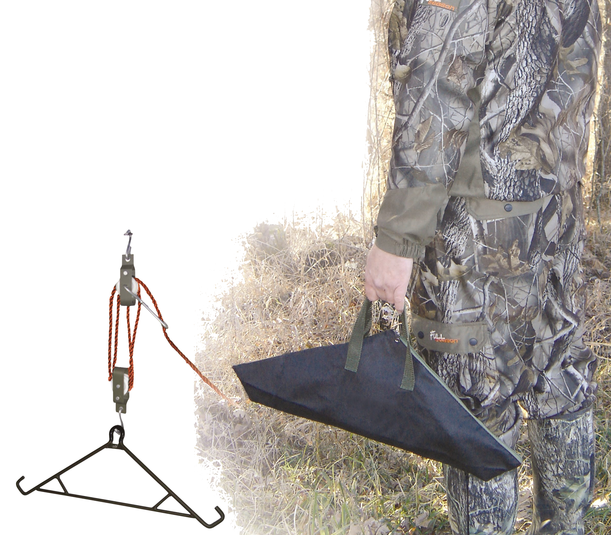 Hme's 4:1 gambrel game hanger features a weight-reduction pulley system which makes it much easier for one person to hoist their game.The carry bag helps keep all the components and rope from getting tangled up and is great for off-season storage.The 3/8" hanger is fully welded and gusseted for added strength and a special hook design makes the hanging of your deer or other large game an easier task.This gambrel and components have a powder coat finish and are rated at 500 lbs.