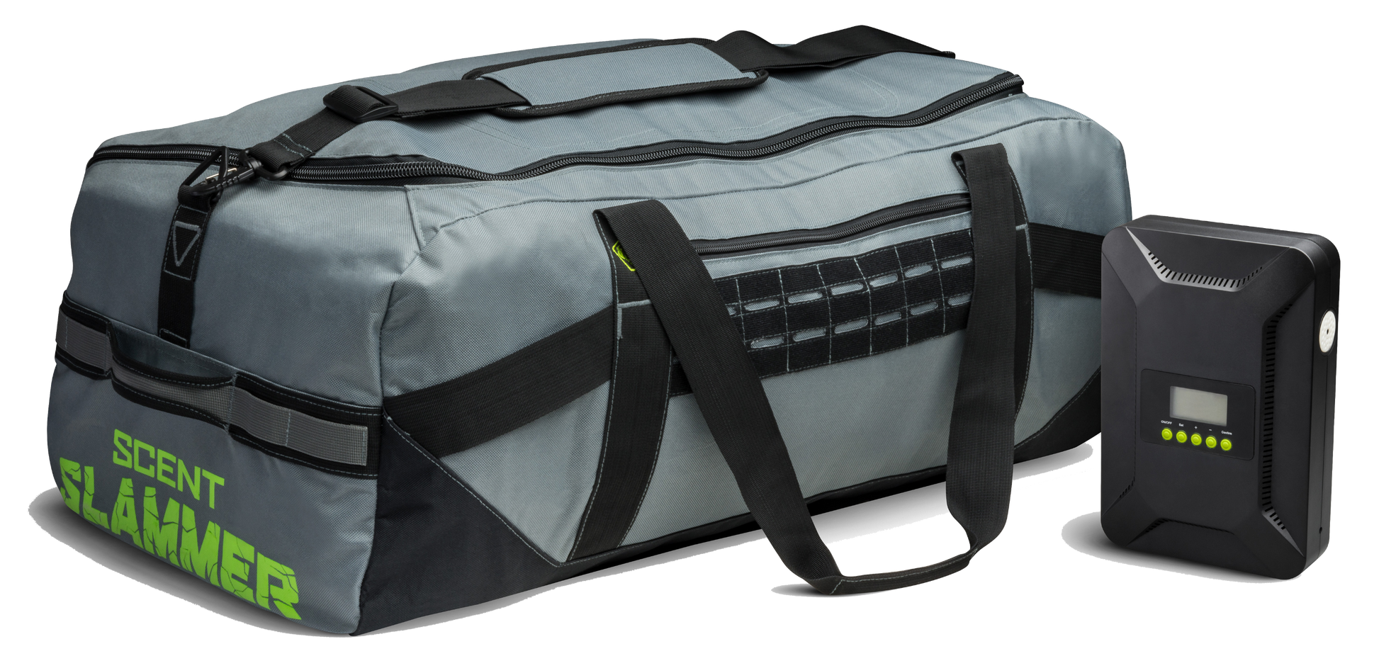 Hme's scent slammer bag w/ozone eliminates odor on clothing/gear, and is 100 percent chemical-free, leaving no scent or residue.The large duffle has a wide full top opening, side zipper pouch, reinforced corners and bottom for durability, and an external pouch for ozone device with tube routing.Included is an ozone odor eliminator, ac and car adapter and shoulder strap.