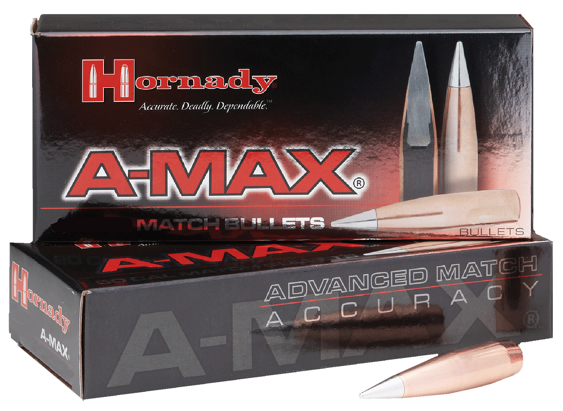 Hornady's a-max bullet features uniform point which raises the ballistic coefficient and precisely balances the center of pressure relative to the center of gravity in order to achieve optimal inflight stability.The geometric profile works to produce low drag and flatter trajectories, while the secant ogive design also provides the optimum bearing surface for stability in flight and the best ballistic coefficient possible.It utilizes a swaged lead core and amp jacket.