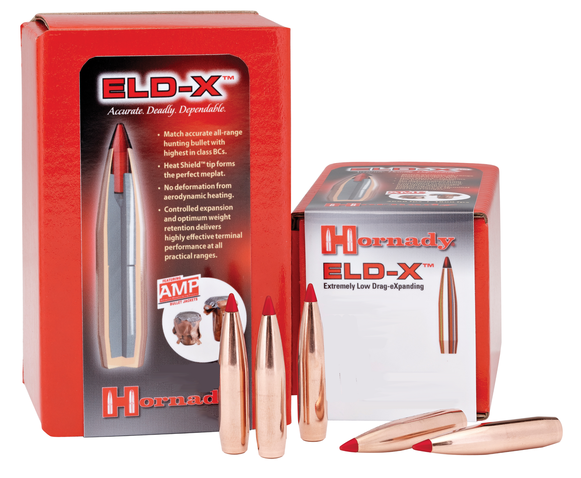 Hornady's eld-x bullet is a technologically advanced, match accurate, all range hunting bullet.It features highest in class ballistic coefficients and consistent, controlled expansion at all practical hunting distances.Its heat shield tip is immune to the effects of aerodynamic heating and retains its shape to maintain the highest-in-class bc over its entire trajectory.It utilizes a streamlined secant ogive with optimum boattail design and highly concentric amp bullet jackets.The thick shank of the jacket and high interlock ring keep the core and jacket together providing 50-60% weight retention.