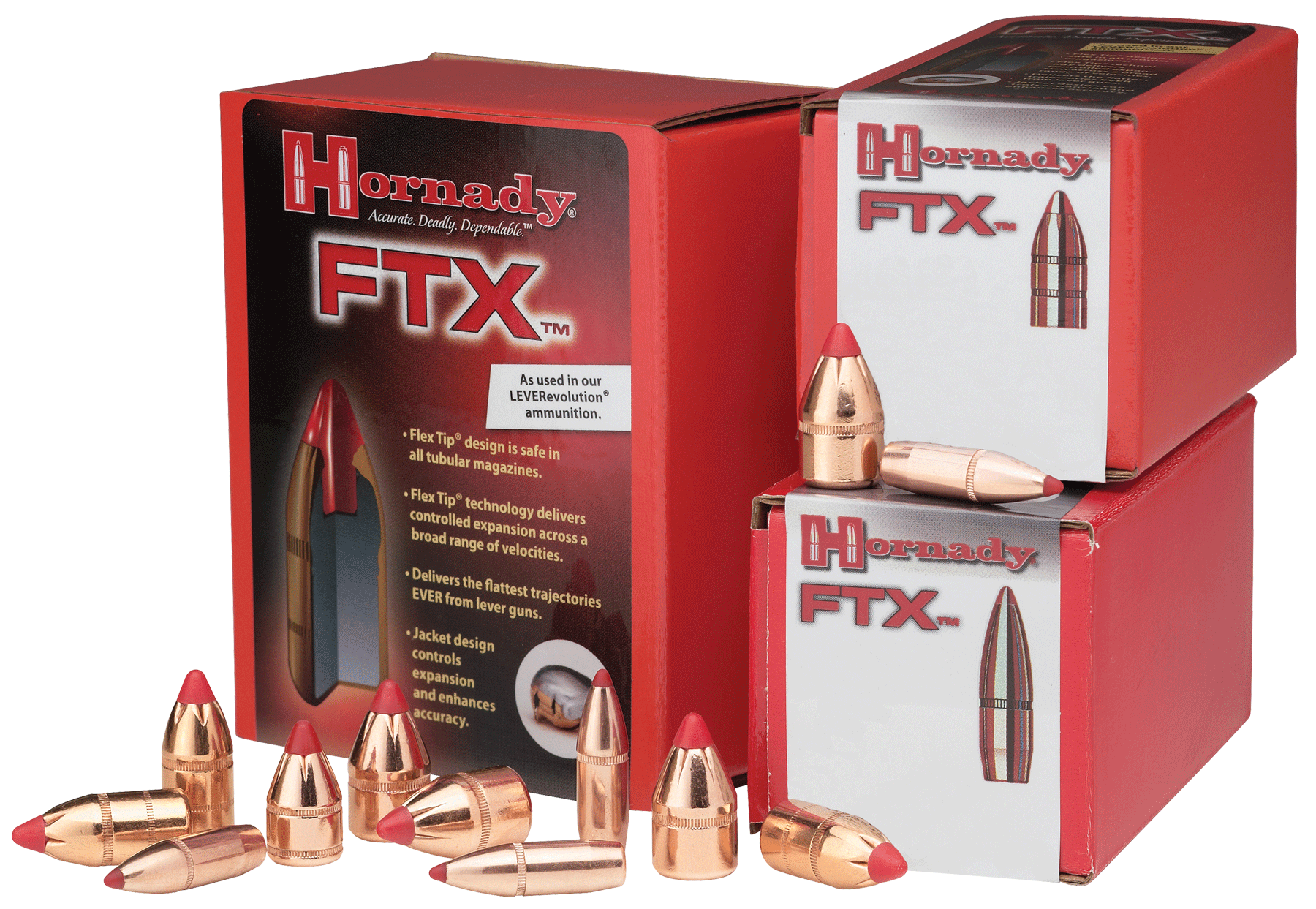Hornady's ftx rifle bullets revolutionized lever gun ballistics, creating a level of performance for these popular firearms.The patented flex tip, combined with its secant ogive design, creates an aerodynamic bullet with a thinner, tapered front section and extended bearing surface for much higher ballistic coefficients.The high antimony lead core is locked to the jacket with an interlock ring, resulting in reliable performance and deep penetration on large or heavy-bodied game animals.