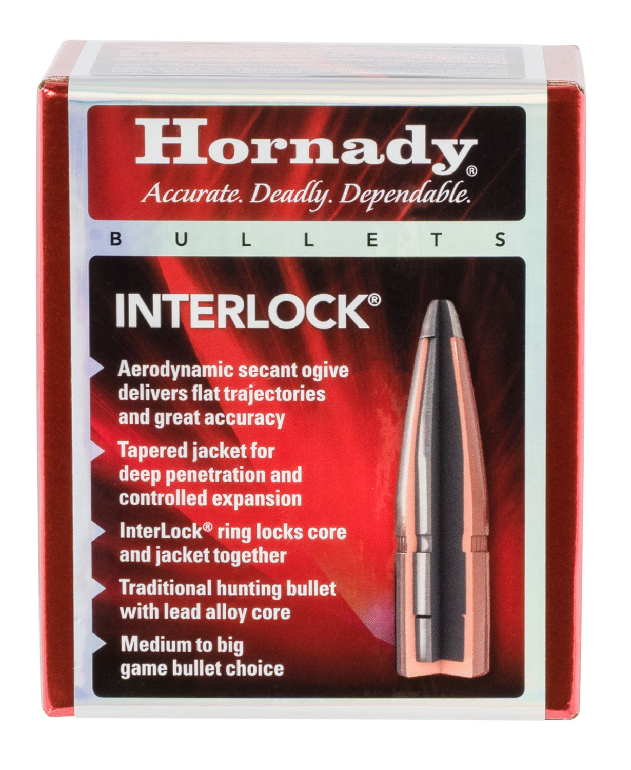 Hornady's traditional line of bullets feature exposed lead tips for controlled expansion and hard-hitting terminal performance.This 245 gr 45 caliber model features their interlock design, a raised ring inside the jacket that is embedded in the bullet's core that keeps the core and jacket locked together during expansion to retain mass and energy.It includes 50 rounds per box.