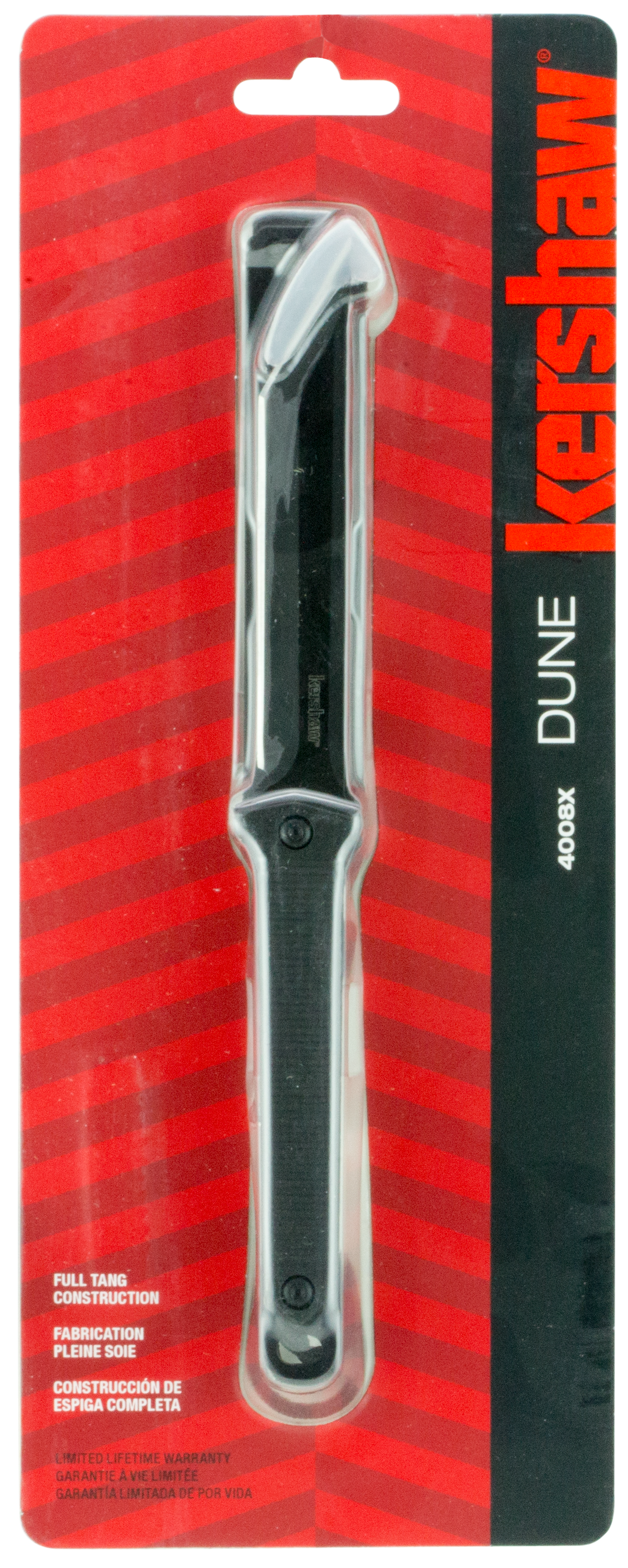 The dune's blade is longer than other neck knives, providing more usable slicing area.It also has a tanto tip ideal for piercing as well as an overall sword like blade design that gives it an unmistakable style.For solid reliability, the dune is a full tang knife and has textured, glass filled nylon scales that make for a lightweight and durable knife with a secure grip.The dune includes its own molded sheath that snaps the knife securely into position, yet releases quickly when needed.The kershaw logo is molded into the sheath.