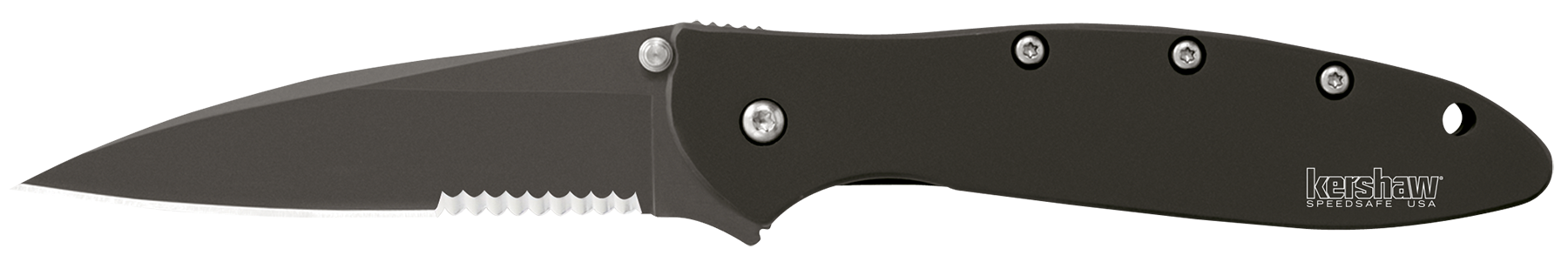 Kershaw's black serrated leek offers ken onion's distinctive design as well as the speedsafe ambidextrous assisted opening system.With speedsafe, the user can smoothly and easily deploy the 3" sandvik 14c28n steel blade with one hand, either left or right.The blade is a modified drop-point, making it a great slicing knife, while the slim tip gives it piercing capability and the ability to do detailed work.This leek offers everything the classic leek has, plus a diamond-like carbon coating of matte black, to a sturdy serrated blade.Made in the usa.