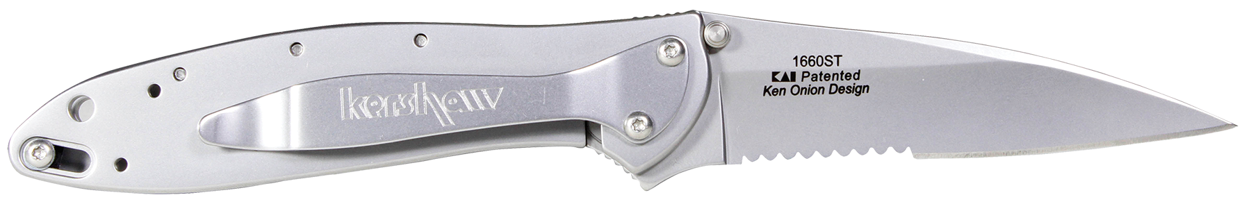 Kershaw's serrated leek offers ken onion's distinctive design as well as the speedsafe ambidextrous assisted opening system.With speedsafe, the user can smoothly and easily deploy the 3" sandvik 14c28n steel blade with one hand, either left or right.The blade is a drop-point, making it a great slicing knife, while the slim tip gives it piercing capability and the ability to do detailed work.Made in the usa.