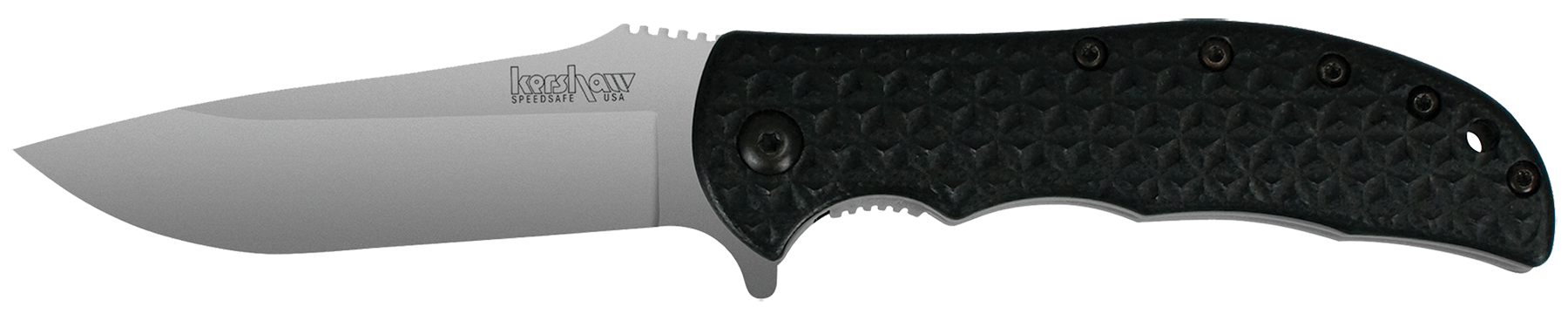 Knife is designed by r.J.Martin and features a drop point blade made of 8cr13mov stainless steel.The blade of this kershaw knife has a non reflective bead blast finish, a notched thumb ramp for secure grip, a flipper for ambidextrous one hand opening.The textured black glass filled nylon handle has finger grooves for secure purchase, dual liners and a grooved back spacer for strength, a liner lock and a lanyard hole.An end to end reversible steel pocket clip is included.