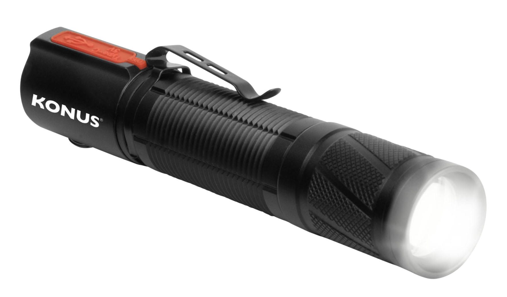 The konuslight rc-7 is a rechargeable tactical flashlight with a 1200 lumen output.Features full metal body; built in 18650 lithium rechargeable batter; intensity adjustment operated via dimmer switch and four modes- high/low/strobe/sos.Includes usb cable.