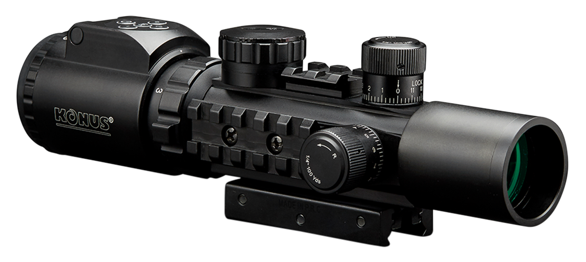 The konuspro as-34 electronic tactical scope has quick target acquiring properties, enhancing speed and accuracy at the range or in close quarter situations.The 34mm tube withstands extreme conditions and the integrated tri-rail system accepts all of your accessories.Features an engraved dual illuminated (red/green) mil-dot reticle, illuminated level bubble, dual illuminator switch with 5 brightness settings; reversible base will fit weaver/picatinny and.22 rails; wide angle; locking tactical turrets and base is reversible and will fit both the weaver/picatinny and.22 rails.