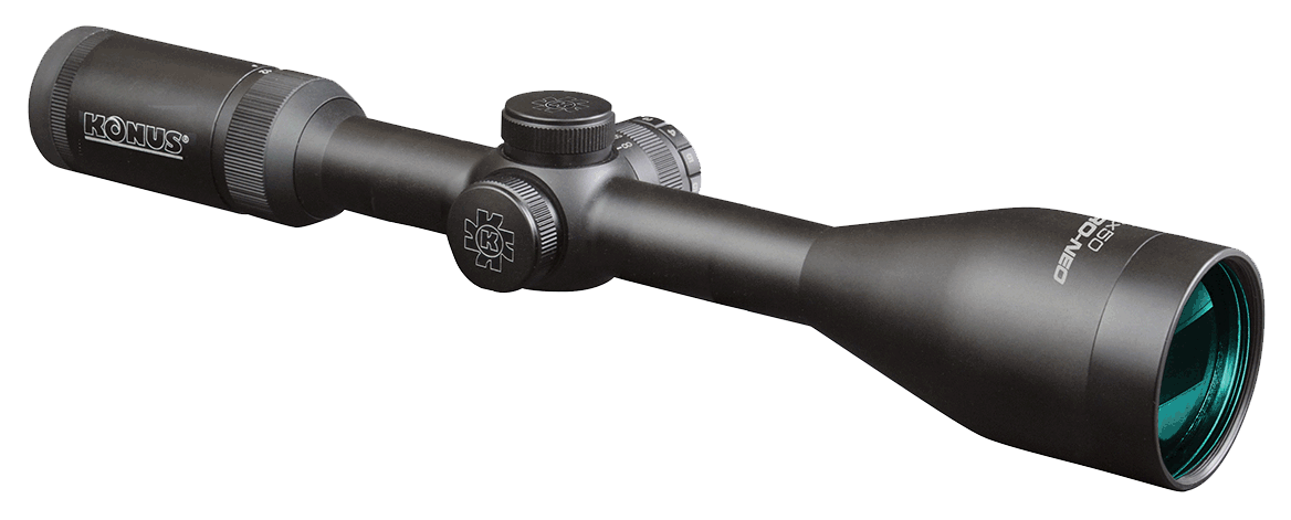 The konuspro evo has a 20 percent higher generous field of view than other comparable scopes.The scope features a side parallax adjusting knob, low profile tactical turrets, one piece tube and an engraved 30/30 dual (red/blue) illuminated floating cross reticle.Includes sunshade.