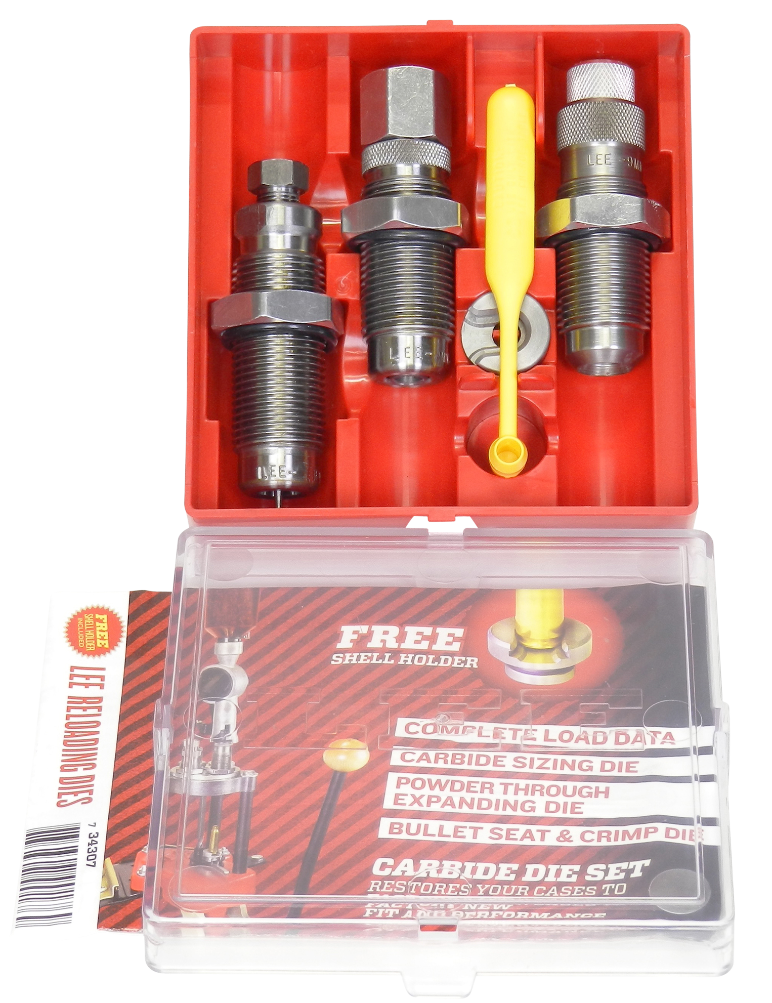 Lee's carbide 3-die set includes carbide full length sizing die, powder thru expanding die, universal shell holder, powder dipper and instructions/load data.