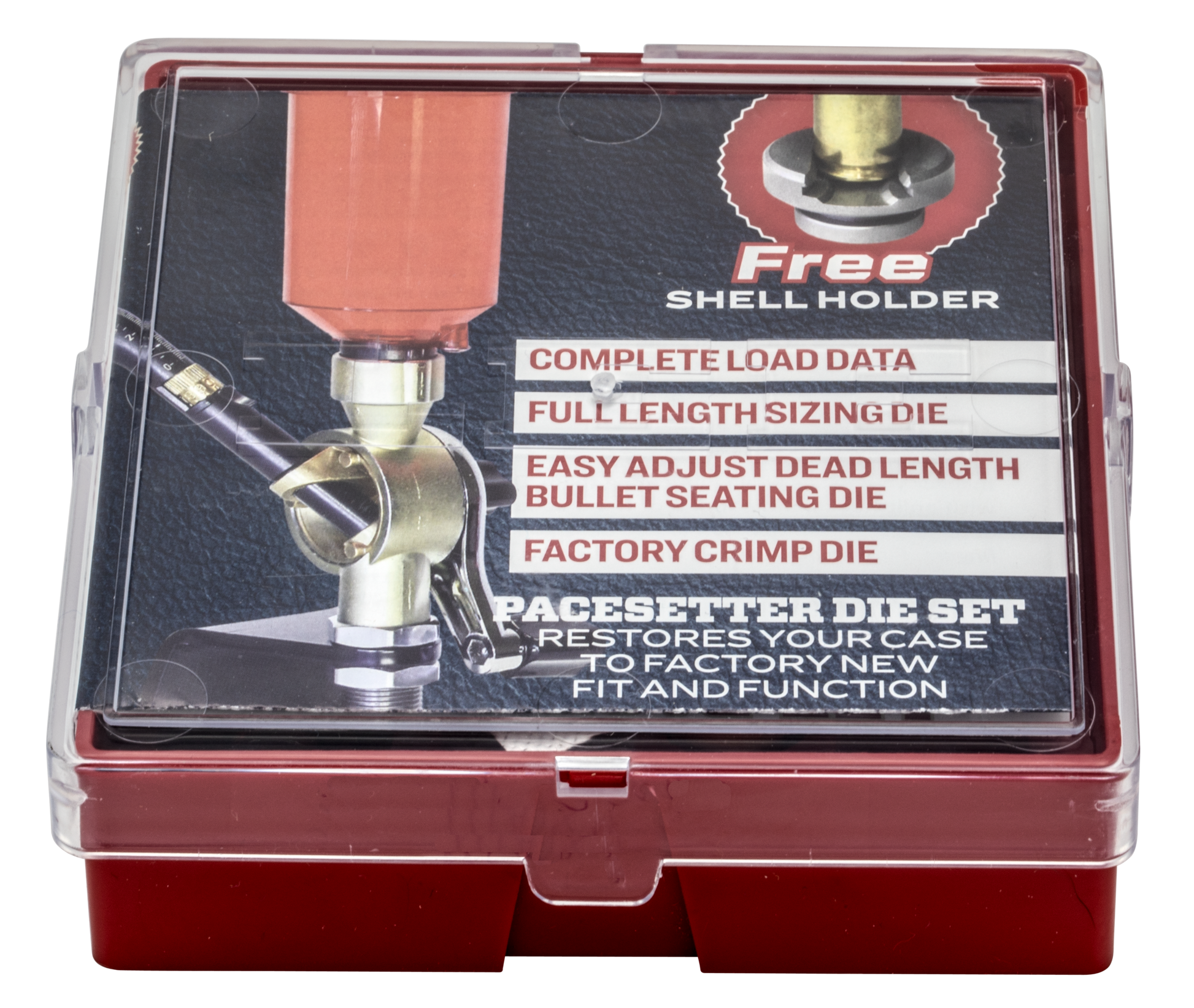 Lee's pacesetter 3-die set includes a full length sizing die, easy adjust dead length bullet seating die, factory crimp die, universal shell holder, powder dipper and instructions/load data.
