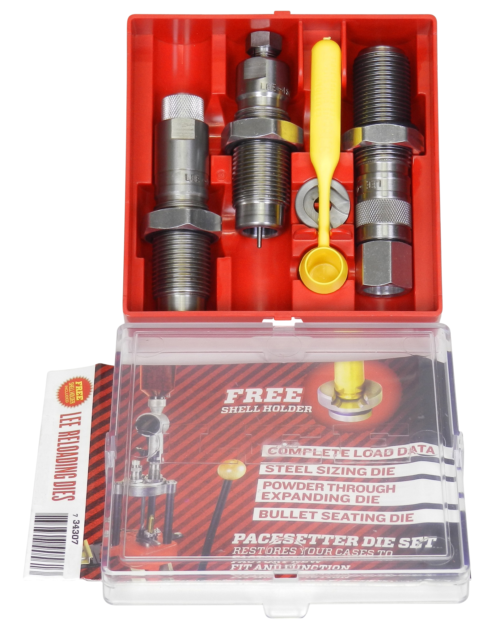 Lee's pacesetter 3-die set includes a full length sizing die, easy adjust dead length bullet seating die, factory crimp die, universal shell holder, powder dipper and instructions/load data.