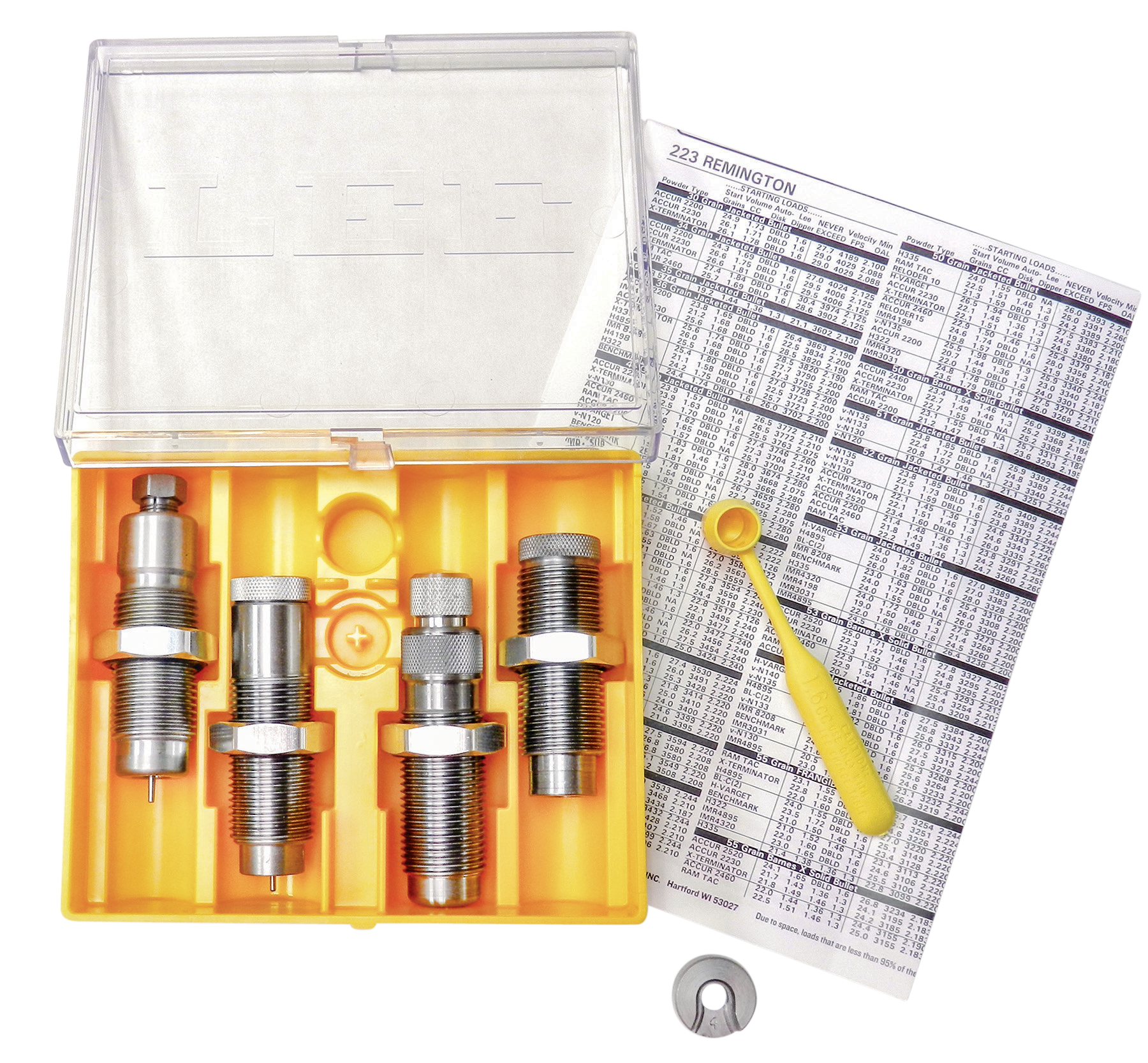 Lee's ultimate rifle 4-die set for maximum versatility.The set features a full length-resizing die to return brass to factory new dimensions, perfect for reloading brass fired in other guns.The collet necksizing die is used on your fire formed brass giving you best possible accuracy.No case lube required when using the collet necksizing die and cases last almost forever.The easy adjust dead length bullet seating die foolproofs the bullet seating adjustment and assures perfect seating depth every time.The factory crimp die provides a secure crimp on bullets with or without a crimp groove.The set is complete, with shell holder, powder measure and lee load data featuring all common brands of powder.