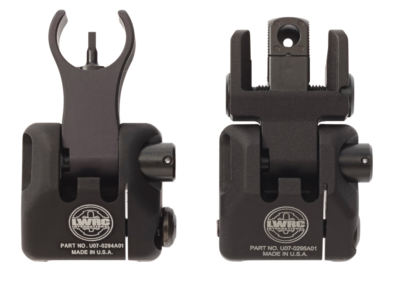 Lwrci's skirmish sights incorporate a host of practical features into a comfortably new design.All of the sharp edges on these low-profile sights have been rounded to prevent snags and cuts to the operator.The folded profile of the sight has been kept to only half an inch.The sights lock securely into the "up" position and are lowered by pressing the button on their left sides.The sights are constructed mainly of anodize 7075 aluminum and nicorr-coated 4140 steel.Mountable to any 1913 picatinny rail, skirmish sights feature a locking helicoil which requires no additional thread lock for installation and will stand up to thousands of rounds of recoil and rugged use.