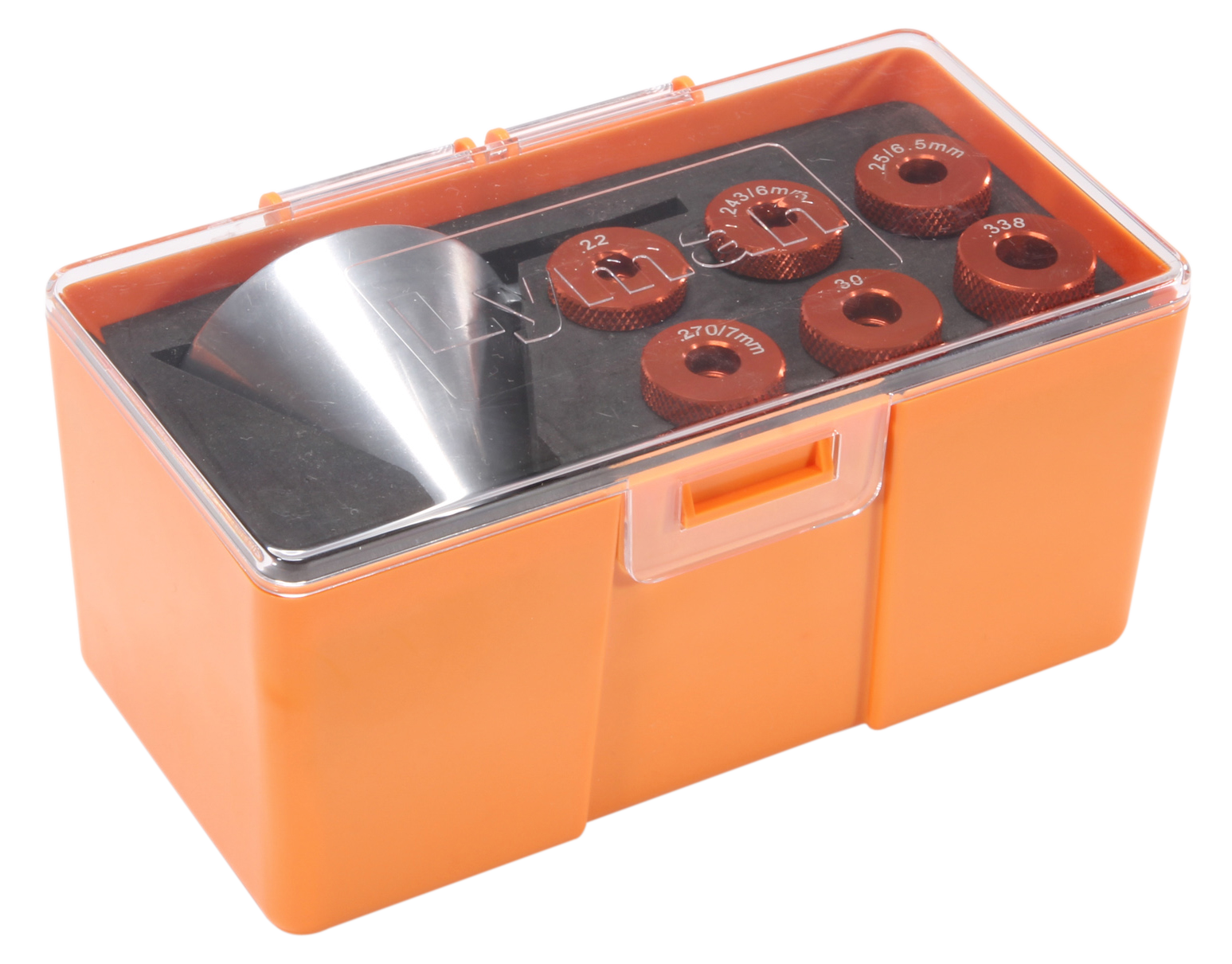 Lyman's precision funnel set is the perfect system for the serious reloader.The brass smith precision funnel set is made to be completely static free, no more powder clinging to surfaces which can happen with lightweight plastic funnels.The solid construction and quality of the brass smith precision funnel set will be apparent in its first use.This is no "one size fits all" funnel, it uses precision machined, caliber specific inserts to properly fit the case neck.The inserts can be quickly and easily installed by simply pushing them into place and then pulling them out when changing calibers.The brass smith precision funnel set also comes with a padded storage case that neatly stores extra inserts when not in use.The funnel comes with inserts for.22, 243/6mm, 25/6.5mm, 270/7mm,.30, and.338 caliber rifle cartridges.