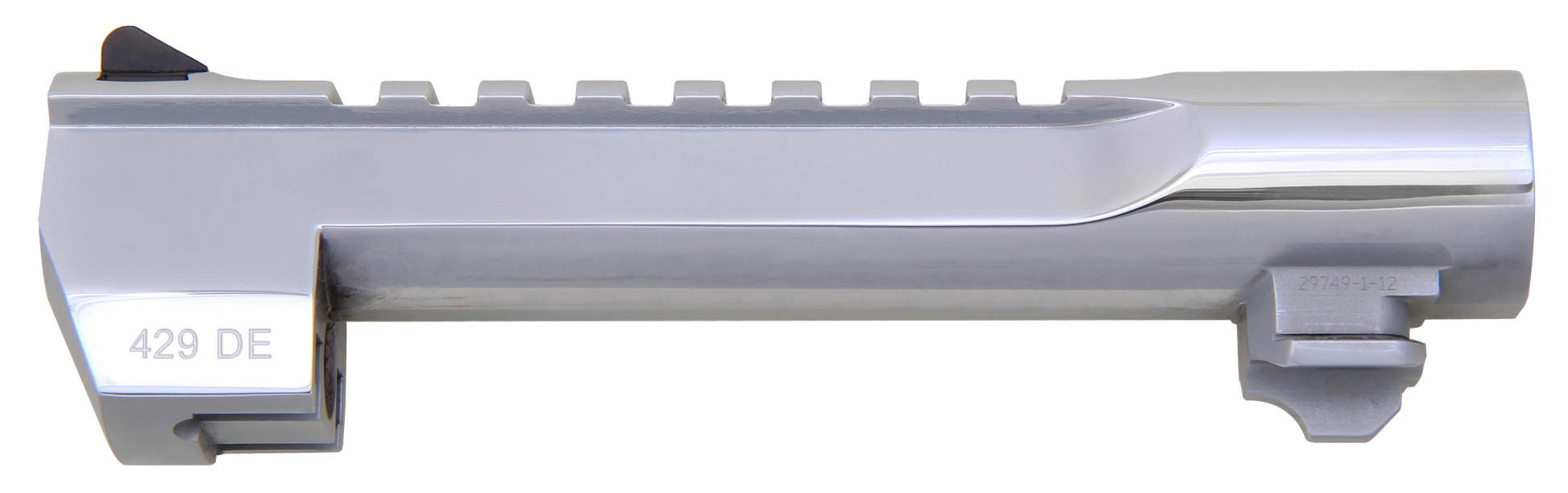 This replacement barrel is constructed of stainless steel with an integrated picatinny rail and fixed front sight.It is compatible with the desert eagle 429de.This model has a polished chrome finish.