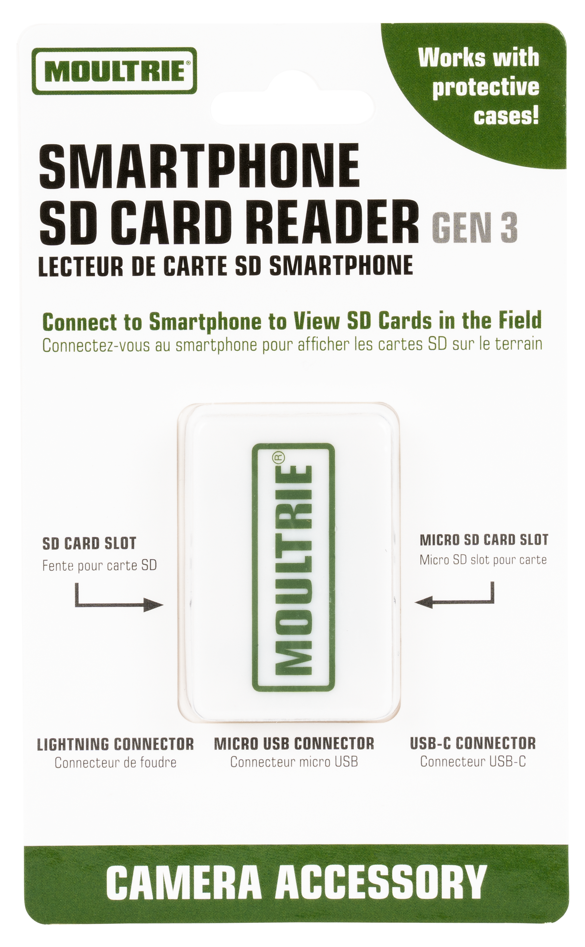 Easily check trail camera cards in the field with the moultrie smartphone sd card reader gen3.The reader is compatible with sd and micro sd cards, lightning, usb-c and micro-usb connectors.Download the free app for apple or android and you'll be ready to quickly scan photos in the field with the card reader gen3.