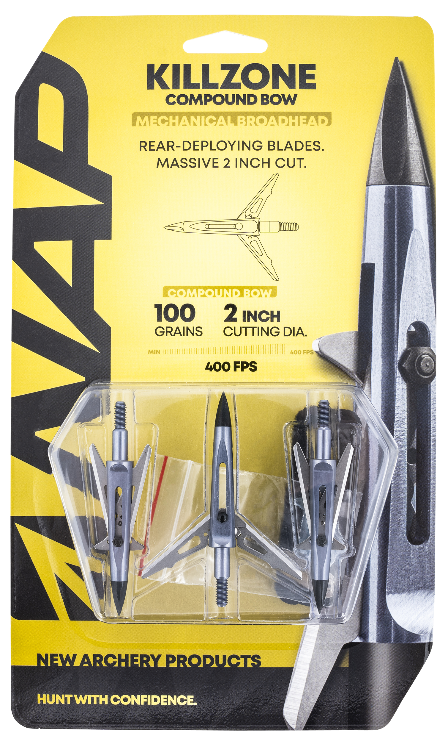 The killzone is a 2 blade rear-deploying mechanical broadhead that packs a devastating 2 cutting diameter.The field-point accurate killzone uses naps unique spring-clip design which ensures your blades wont open in flight or in your quiver.There are no o-rings or rubber bands to worry about.