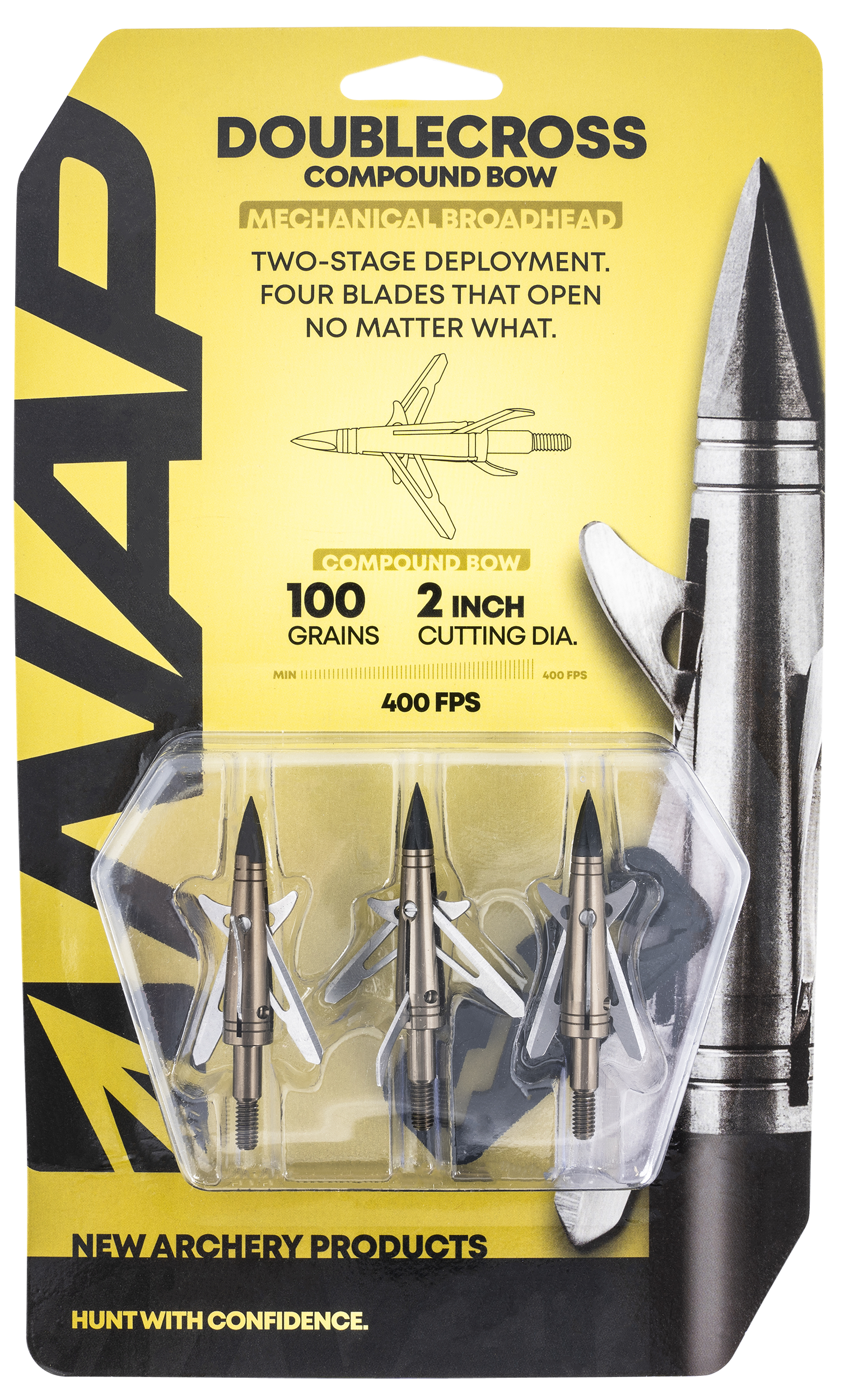 The american-made spitfire doublecross is a 100-grain broadhead that integrates four, no-fail blades with two-stage blade deployment.2" main cutting diameter.1 1/8" secondary cutting diameter.3 per pack.