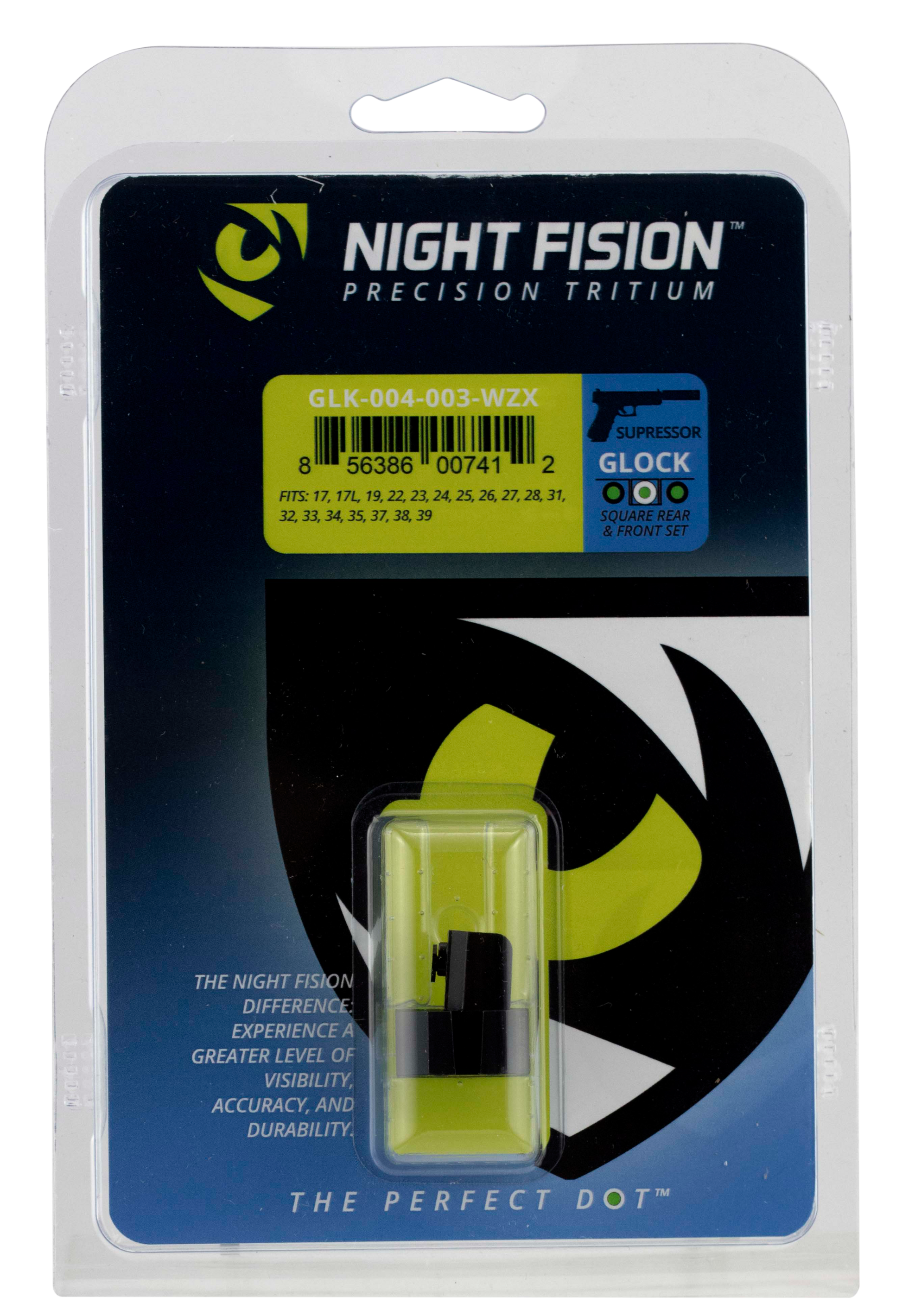 Night fision utilizes an injection molded process and military-grade polymer with durable polymer tritium outlines to give you flexibility and unrivaled daytime visibility.With the exception of the tritium vials, imported from switzerland, night fision products are crafted end-to-end right here in the usa.This night sight set is a square front and rear green tritium with a white outline, and fits glock models 17/17l/19/22/24/24/25/26/27/28/31/32/33/34/35/36/38/39 at suppressor height.
