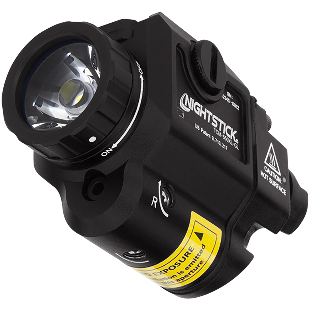 The tcm-550xl-gl compact tactical weapon-mounted light with green laser uses a super-bright led rated at 550 lumens working in conjunction with a precision-engineered total internal reflection (tir) lens to create a bright white beam of light rated at 136 meters.This weapon light features completely ambidextrous and intuitive rear-facing toggle switches on each side of the light to operate the momentary or constant-on of the white light, class iiia 532nm daylight-visible green laser or light and laser together.The housing of the tcm-550xl-gl is constructed from aluminum with a polymer rear housing.Includes five handgun-specific modular rail inserts (pre-configured with c1 insert for glock pistols), two spare allen screws, allen wrenches and one cr123 lithium battery.