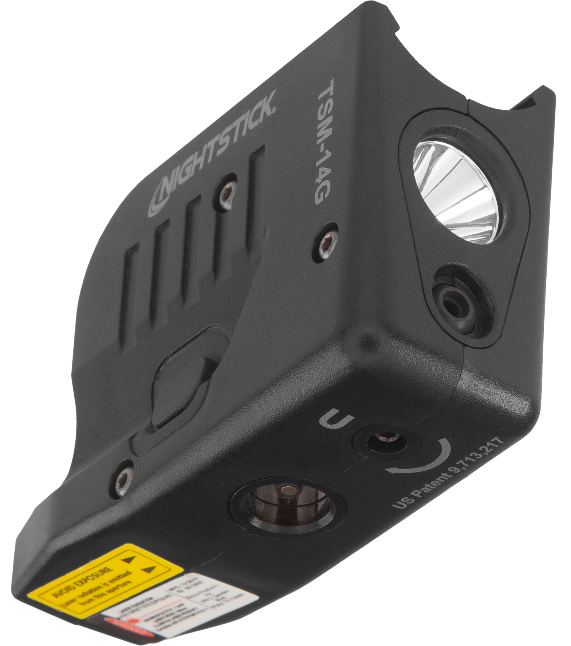 The tsm-15g subcompact tactical weapon-mounted light with green laser for glock g43x mos and g48 mos sub-compact pistols uses a super-bright led rated at 150 lumens working in conjunction with a precision-engineered miniature reflector to create a bright white beam of light rated at 104 meters.This weapon light features completely ambidextrous and intuitive toggle switches on each side of the light to operate the momentary-on and constant-on lighting modes or class iiia 532nm daylight-visible green laser.These lighting modes include white light, laser or both light and laser.The weapon light includes a nightstick magmate usb magnetically coupled charger, a combination gun lock for secure charging, and an allen screwdriver for installation and laser aim adjustments.