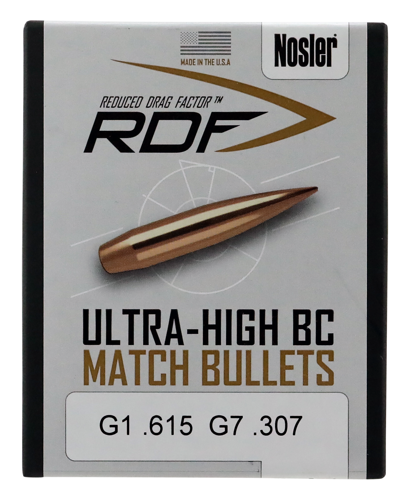 For those wanting to squeeze the most performance from their competition rifle, nosler's rdf (reduced drag factor) match bullet line is the ideal choice.The rdf line was designed from the ground up to provide exceptionally high bcs, which create the flattest trajectory and least wind drift possible.The keys to the rdf's outstanding performance are nosler's meticulously optimized compound ogive and long, drag-reducing boattail, which make handloading a snap and create an incredibly sleek form factor.Rdf bullets also have the smallest, most consistent meplats of any hollow point match bullet line, so there is no need to point or trim tips.