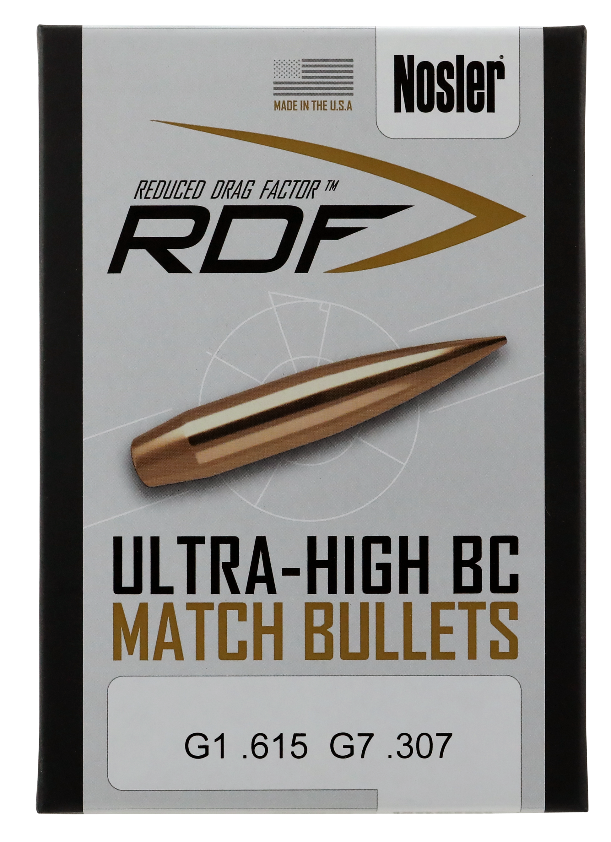 For those wanting to squeeze the most performance from their competition rifle, nosler's rdf (reduced drag factor) match bullet line is the ideal choice.The rdf line was designed from the ground up to provide exceptionally high bcs, which create the flattest trajectory and least wind drift possible.The keys to the rdf's outstanding performance are nosler's meticulously optimized compound ogive and long, drag-reducing boattail, which make handloading a snap and create an incredibly sleek form factor.Rdf bullets also have the smallest, most consistent meplats of any hollow point match bullet line, so there is no need to point or trim tips.