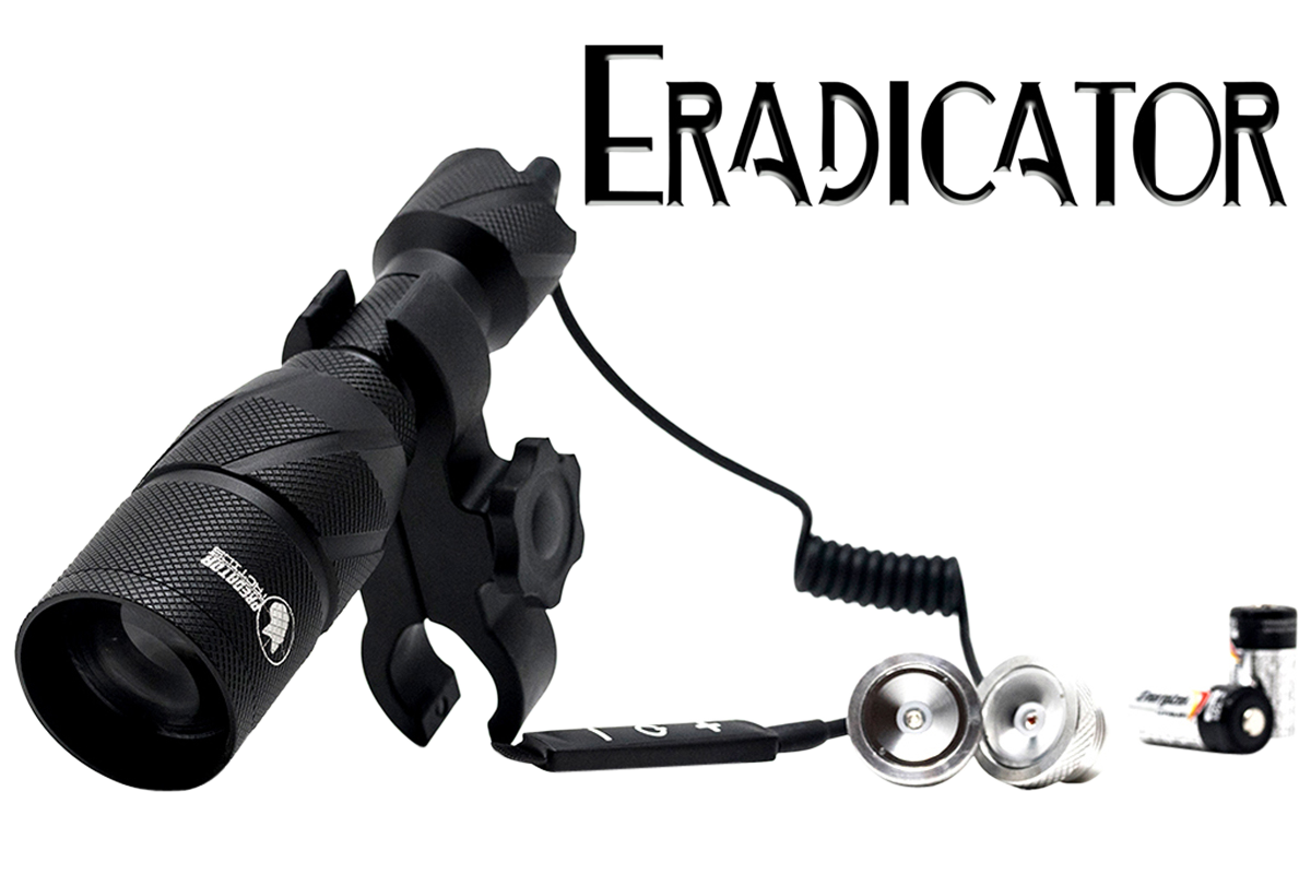 The eradicator by predator tactics is a great choice for the budget minded hunter that is in need of a great predator hunting light or hog hunting light.The eradicator comes equipped with intensity control, adjustable focus, silent remote switch, interchangeable leds and up to 300 yards of beam throw.The eradicator predator & hog gun light will quickly attach to your scope with the included scope mount and have you out in the field chasing predators and hogs in no time.Includes universal scope mount, 18-650 li-ion battery and charger.