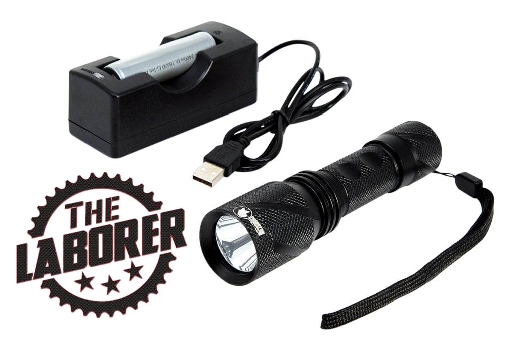 The laborer flashlight is a small, compact high lumen every day carry light that can easily be carried on hunting trips.It produces 890 lumens of bright white light.It is built to stand up against the toughest work environments and is waterproof to give you peace of mind with its ability to work as hard as you do.The laborer flashlight can be powered by a single 18-650 rechargeable battery or a pair of cr123 batteries.Includes 18-650 li-ion battery and charger.